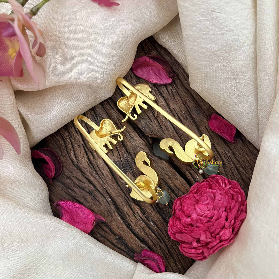 Embrace timeless elegance with this magnificent Jadau Kundan stud and ear cuff ensemble, showcasing intricate elephant and peacock designs. Embellished with radiant pearls set in luxurious red and green tones, this piece exemplifies the pinnacle of traditional Indian jewelry artistry. The coordinated stud-and-cuff combination delivers a refined, layered aesthetic ideal for weddings, festivals, and momentous celebrations. Meticulously crafted using time-honored Kundan techniques, each detail reflects exceptional artisanal skill and commitment to preserving authentic heritage craftsmanship.