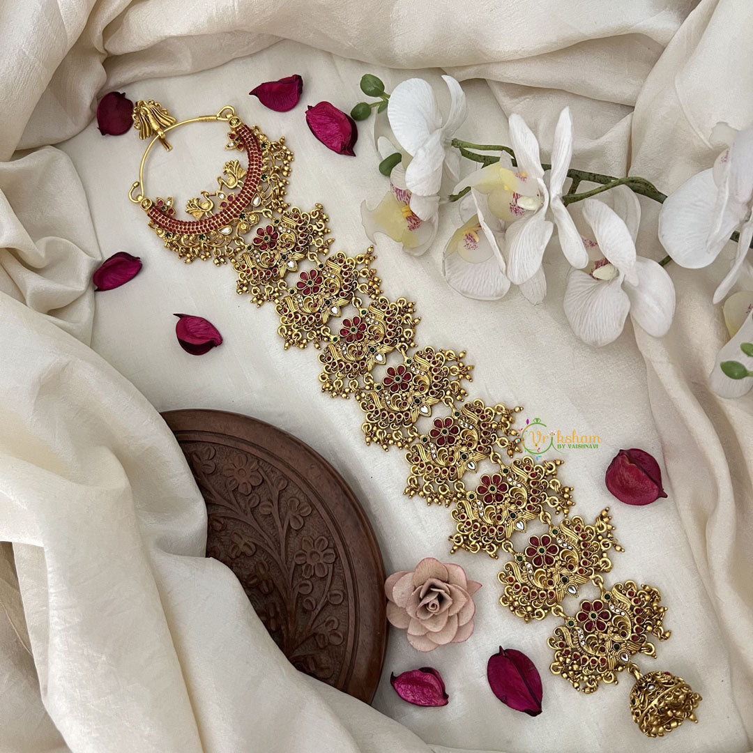 The Vriksham Elegant Peacock with Floral Bridal Jada Billai features delicate gold beads that highlight its intricate design. This sophisticated piece combines the timeless beauty of peacock motifs with graceful floral accents, creating a stunning accessory that enhances your bridal look with elegance and cultural significance. Perfect for adding a refined touch to your traditional hairstyle.