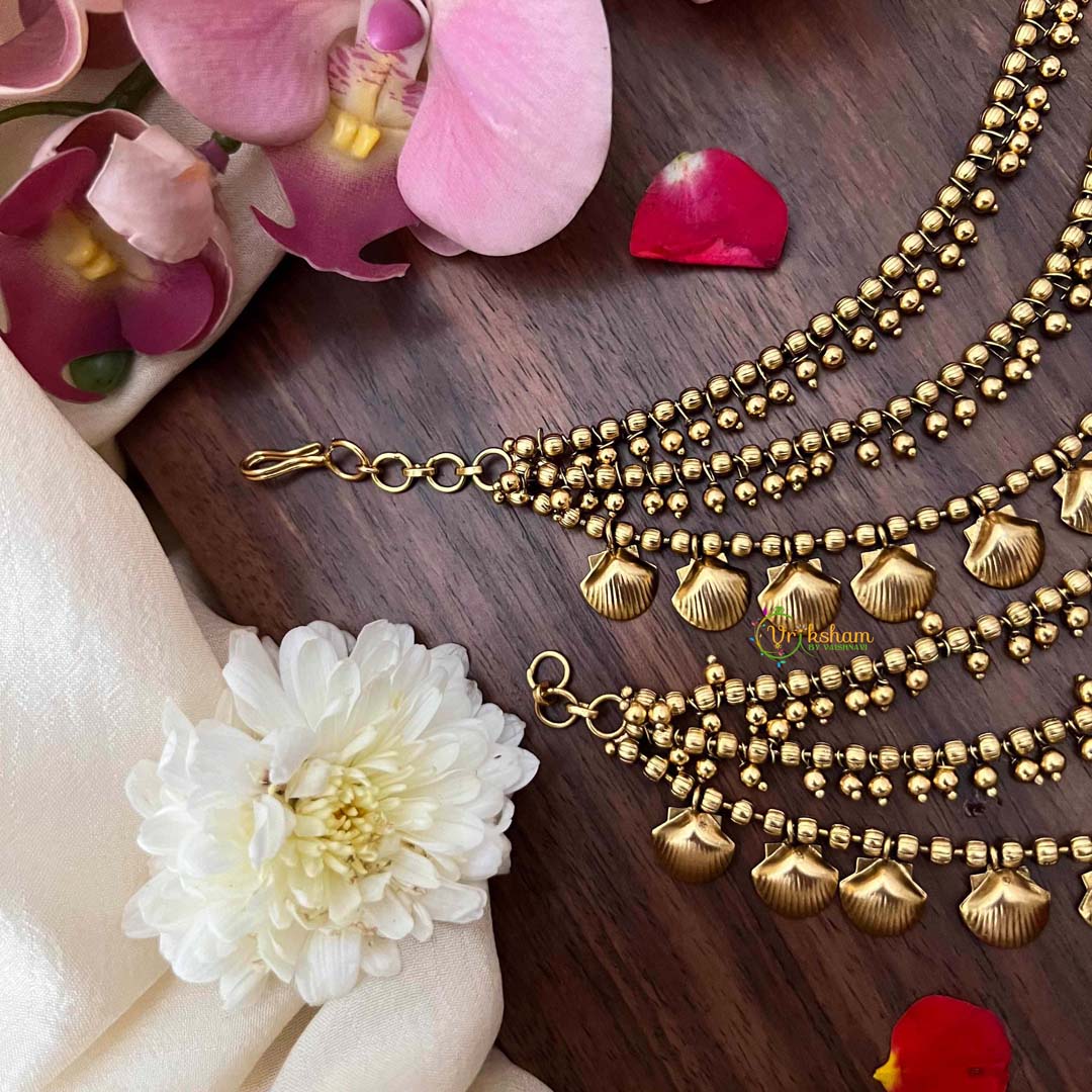 Celebrate heritage with this captivating ethnic maatil, showcasing a refined three-layer gold shell design adorned with gleaming gold beads. The delicate ear chains feature intricate detailing that reflects traditional craftsmanship, while the lustrous gold finish ensures a polished, sophisticated appearance. Perfect for festive occasions, cultural celebrations, and cherished moments, this piece seamlessly bridges ancestral artistry with contemporary elegance. An authentic accessory that honors timeless traditions while adding a touch of understated luxury to your ceremonial ensemble.