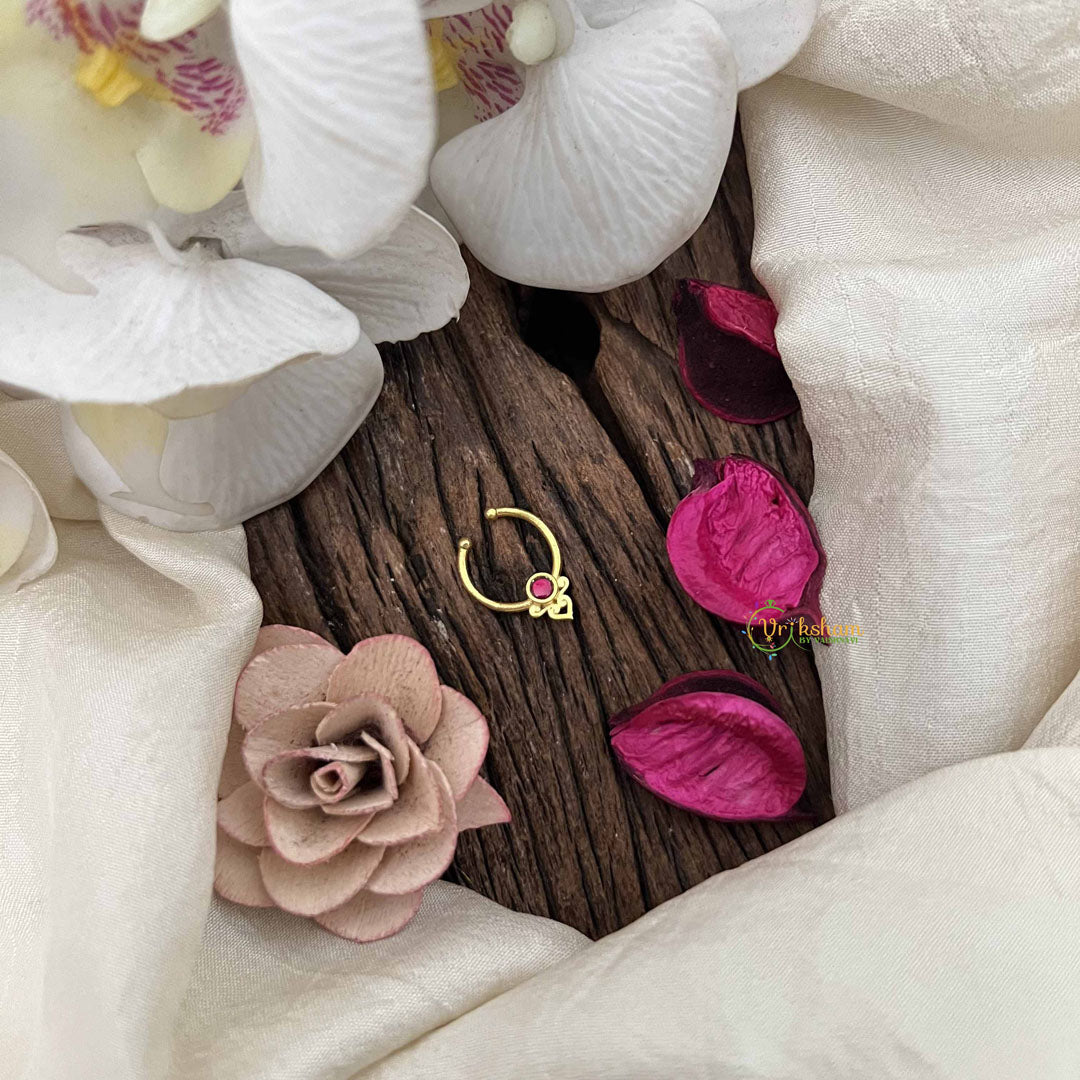 Embrace ethnic elegance with this gold-toned septum ring featuring a striking red Kundan center in a delicate floral design. Its intricate craftsmanship and rich tones provide a sophisticated accent that enhances traditional and contemporary styles alike.