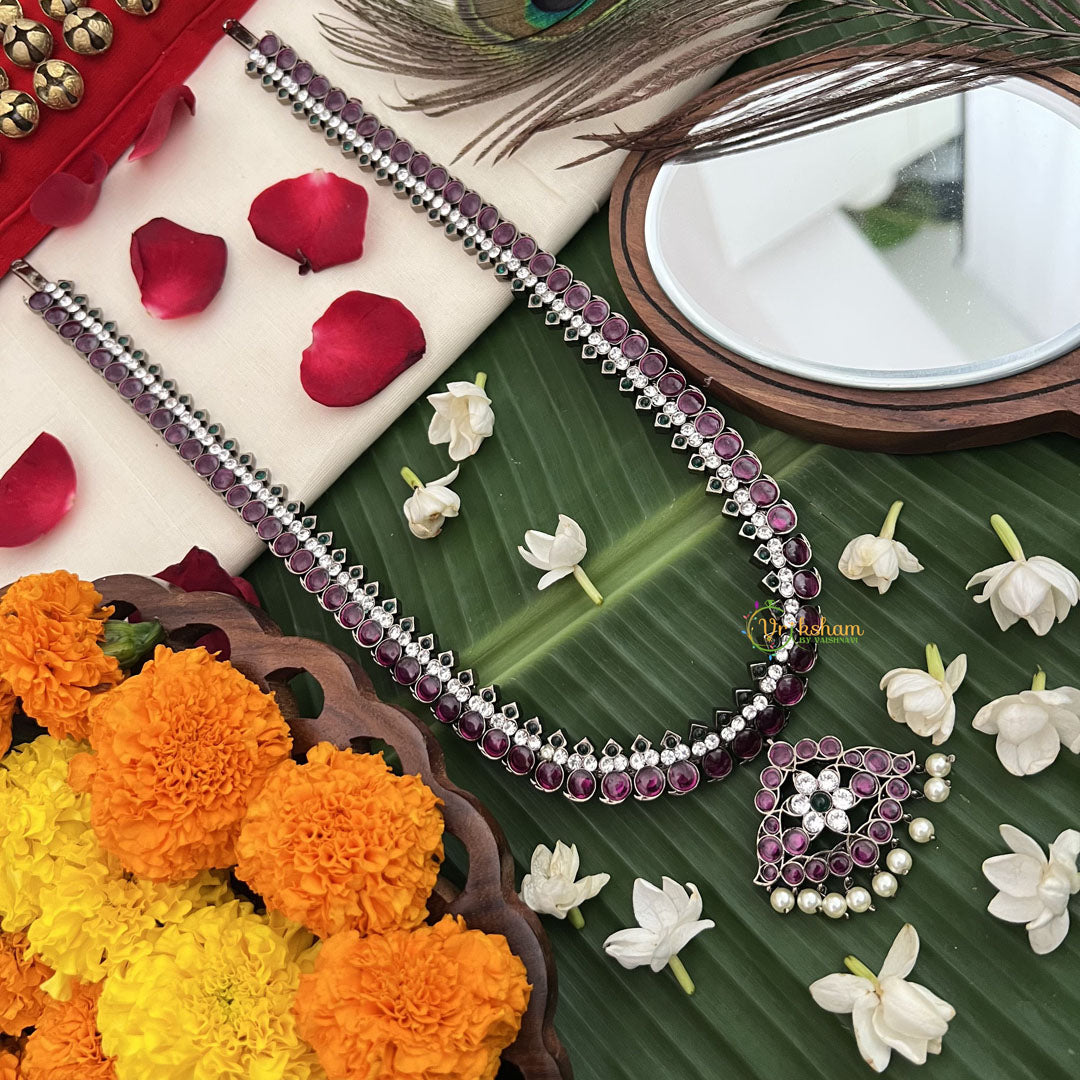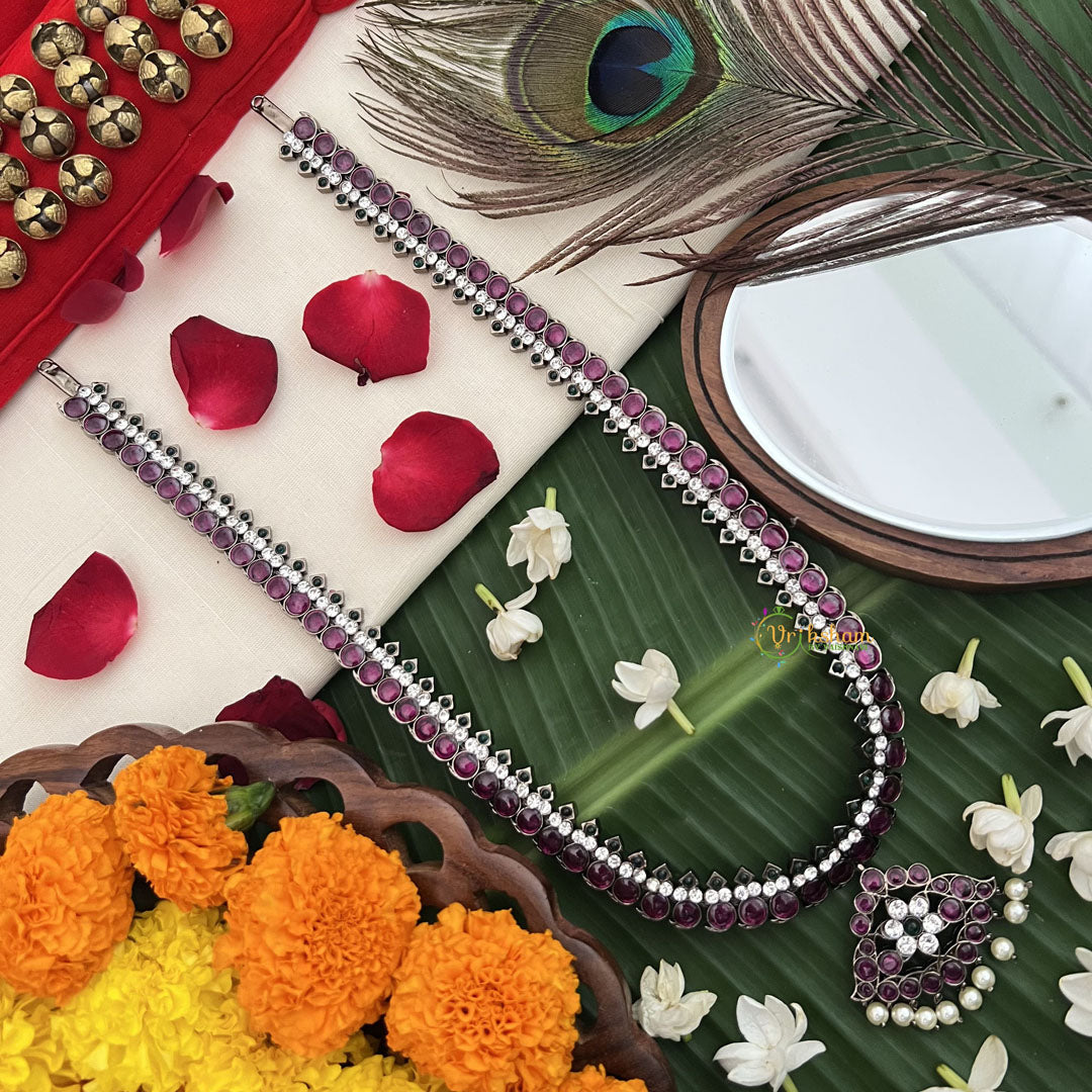 The Vriksham Ethnic Temple Jewellery Black Kemp Long Neckpiece features a distinctive round-style design adorned with striking black Kemp stones and pearls. This sophisticated piece draws inspiration from traditional temple motifs, offering a refined accessory that enhances ethnic and festive attire with timeless elegance.