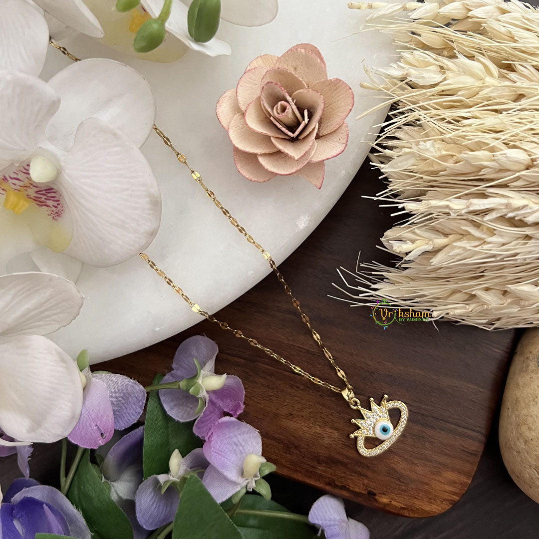 Embrace protection and style with Vriksham's Evil Eye Crown Pendant Necklace. Crafted from anti-tarnish stainless steel, this necklace features a striking evil eye crown pendant. Stay fashionable while warding off negative energy. Elevate your look with this exclusive piece.