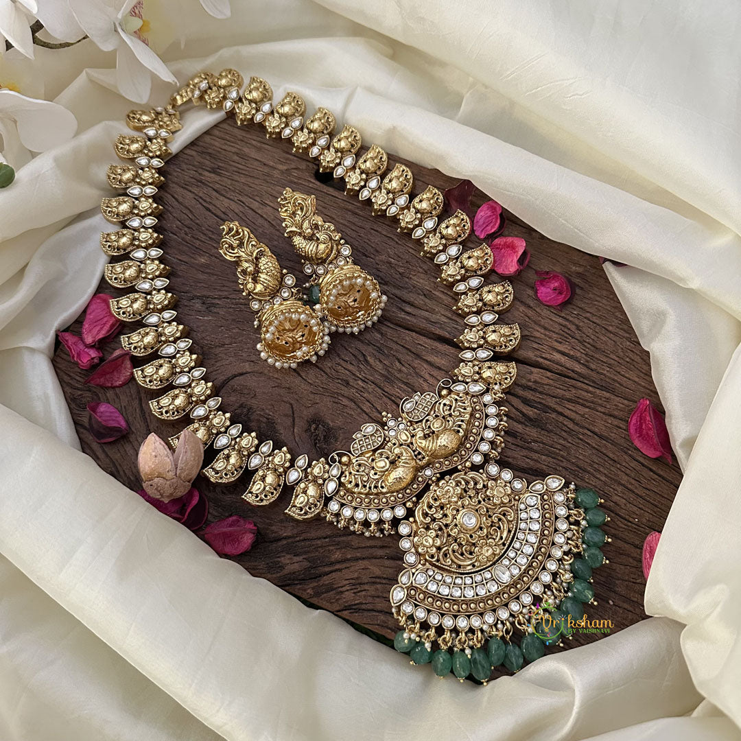 Introducing the Vriksham Exclusive Dual Peacock with Pendant maanga haram - a stunning masterpiece adorned with exquisite white kundan stones. Embodying the grace and elegance of a dual peacock, this haram exudes opulence and sophistication. Elevate your style and make a statement with this luxurious accessory.