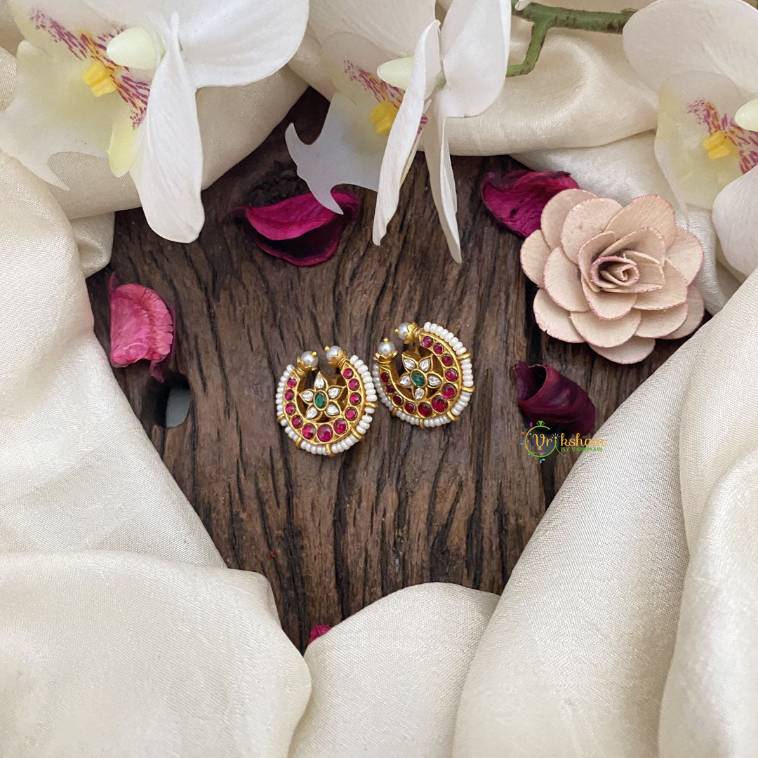 Indulge in the luxury of the Vriksham Exclusive Half Moon Maharashtrian Style Press Bugadi-Pearl. Handcrafted with exquisite detail, this elegant piece features a half moon design and is adorned with lustrous pearls. Elevate your style and embody sophistication with this exclusive bugadi.