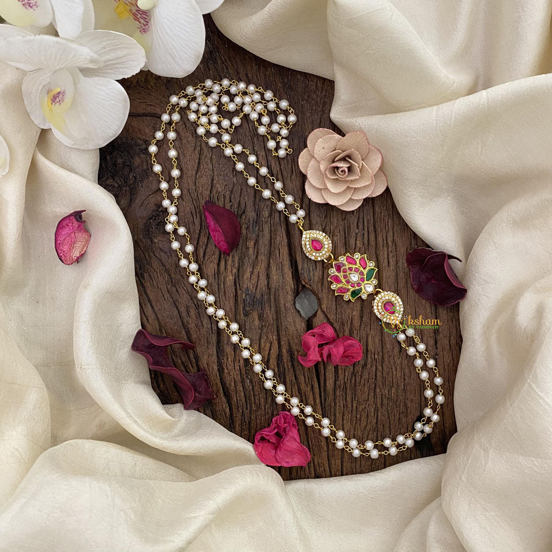 Elevate your style with the Vriksham Exclusive Lotus Moggapu Pearl Chain. This exquisite piece features a delicate lotus charm adorned with lustrous Moggapu pearls. Perfect for any occasion, this chain will add a touch of elegance and sophistication to any outfit. Experience luxury with Vriksham.