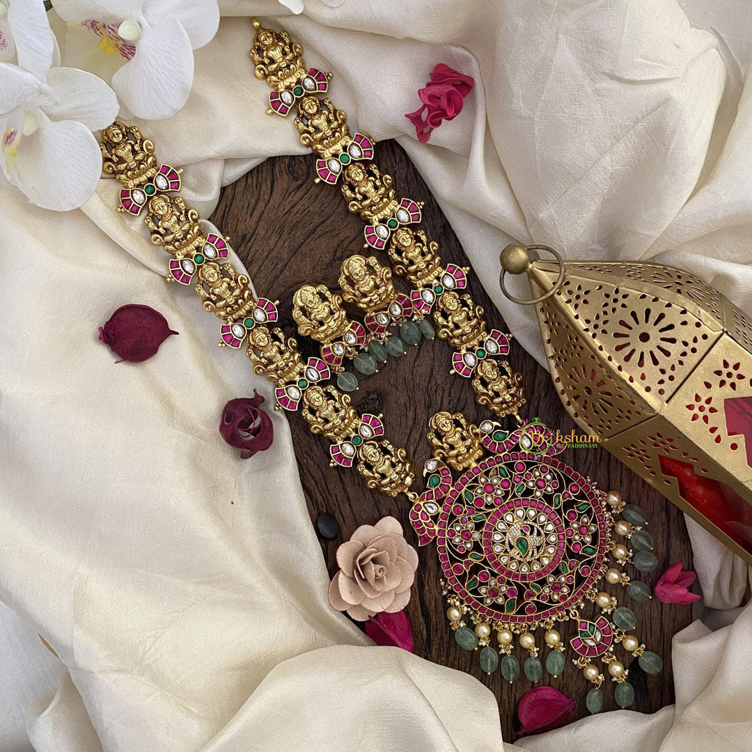 Indulge in the luxurious beauty of our Vriksham Exclusive Pendant Lakshmi Jadau Kundan Neckpiece. Crafted with intricate Kundan work, this neckpiece exudes elegance and sophistication. Adorned with a mesmerizing Lakshmi pendant, it is a perfect blend of traditional and contemporary styles. Elevate your wardrobe with this exclusive piece.
