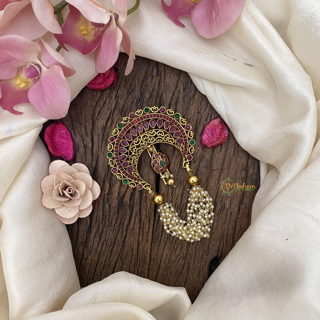 Enhance your beauty with our Vriksham Exclusive Red Green Single Jada Billai-Pearls. These luxurious hair accessories add a touch of sophistication and elegance to any outfit. The intricate design and high-quality pearls make you stand out in any crowd. Elevate your style with Vriksham.