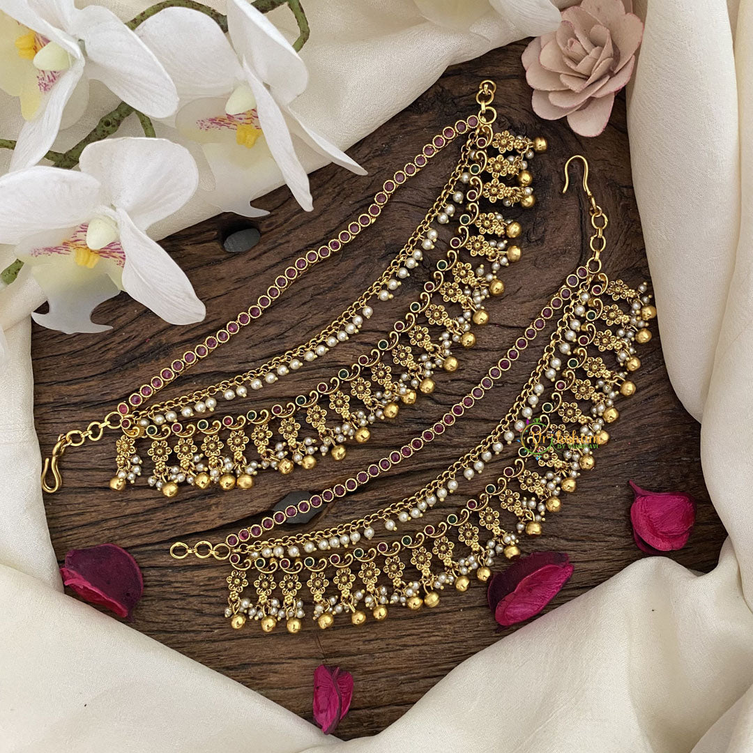 This Vriksham Exquisite 3 layer Floral Maatil-Pearl Gold Bead is a delicate and luxurious piece of jewelry. The intricate floral design and exquisite gold beadwork make it a stunning addition to any outfit. Elevate your style with this exclusive and elegant accessory.