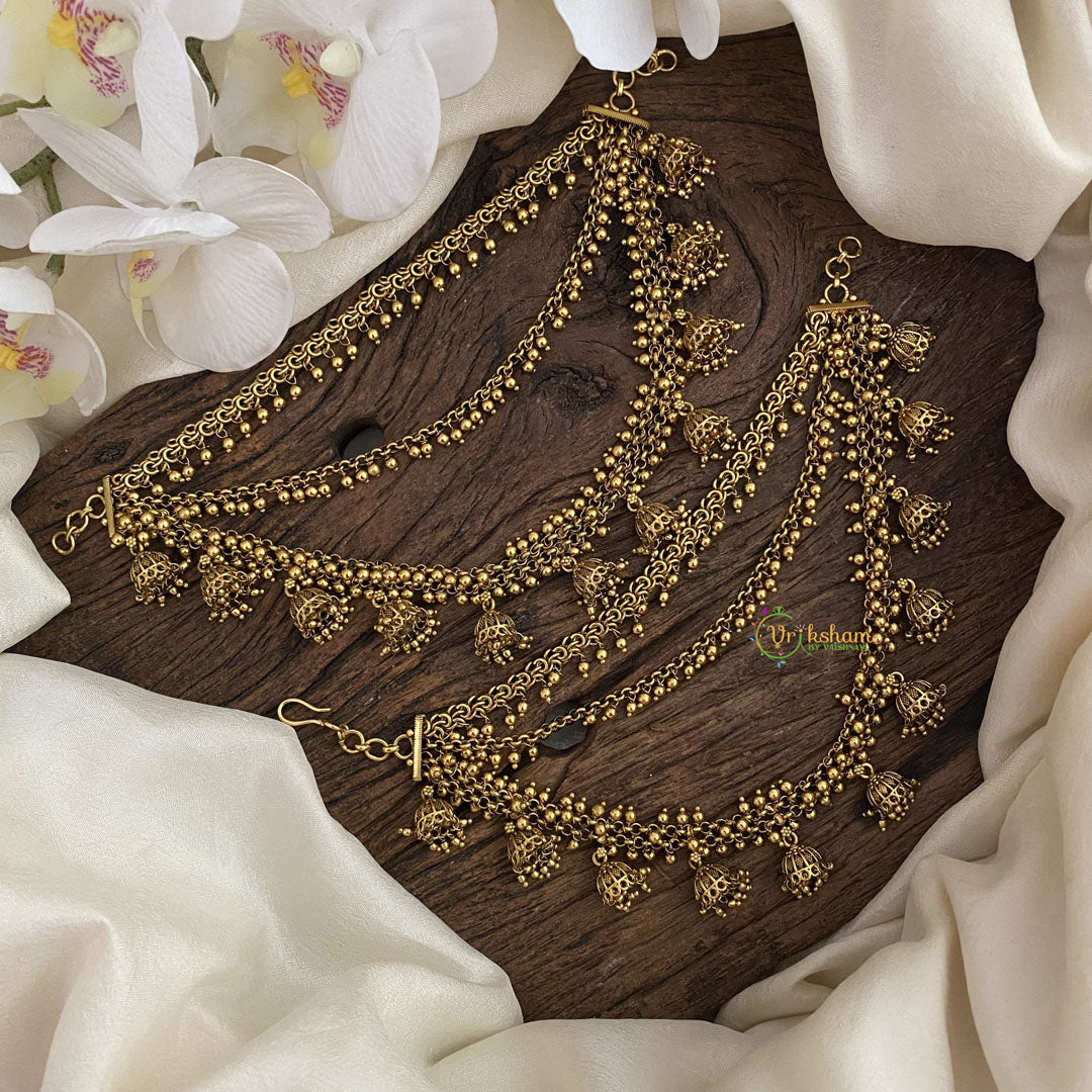 Introducing Vriksham's Exquisite 3 Layered Jhumka Maatil, adorned with delicate gold pearls. This opulent ear chain adds a touch of elegance to any ensemble. Elevate your style and make a statement with this one-of-a-kind piece. Indulge in luxury with Vriksham.