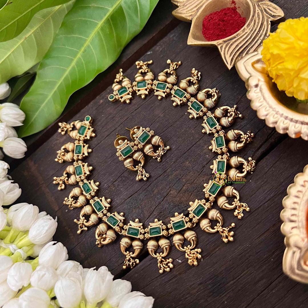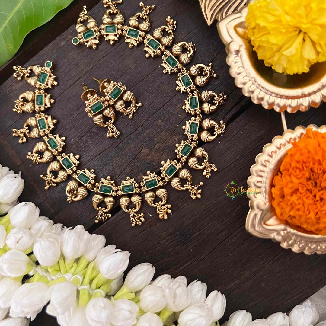 Elevate your style with the Vriksham Exquisite Designer Short Neckpiece. This radiant green necklace features intricate design and high-quality materials, perfect for adding a touch of luxury to any outfit. Make a statement and stand out from the crowd with this exclusive piece from Vriksham.