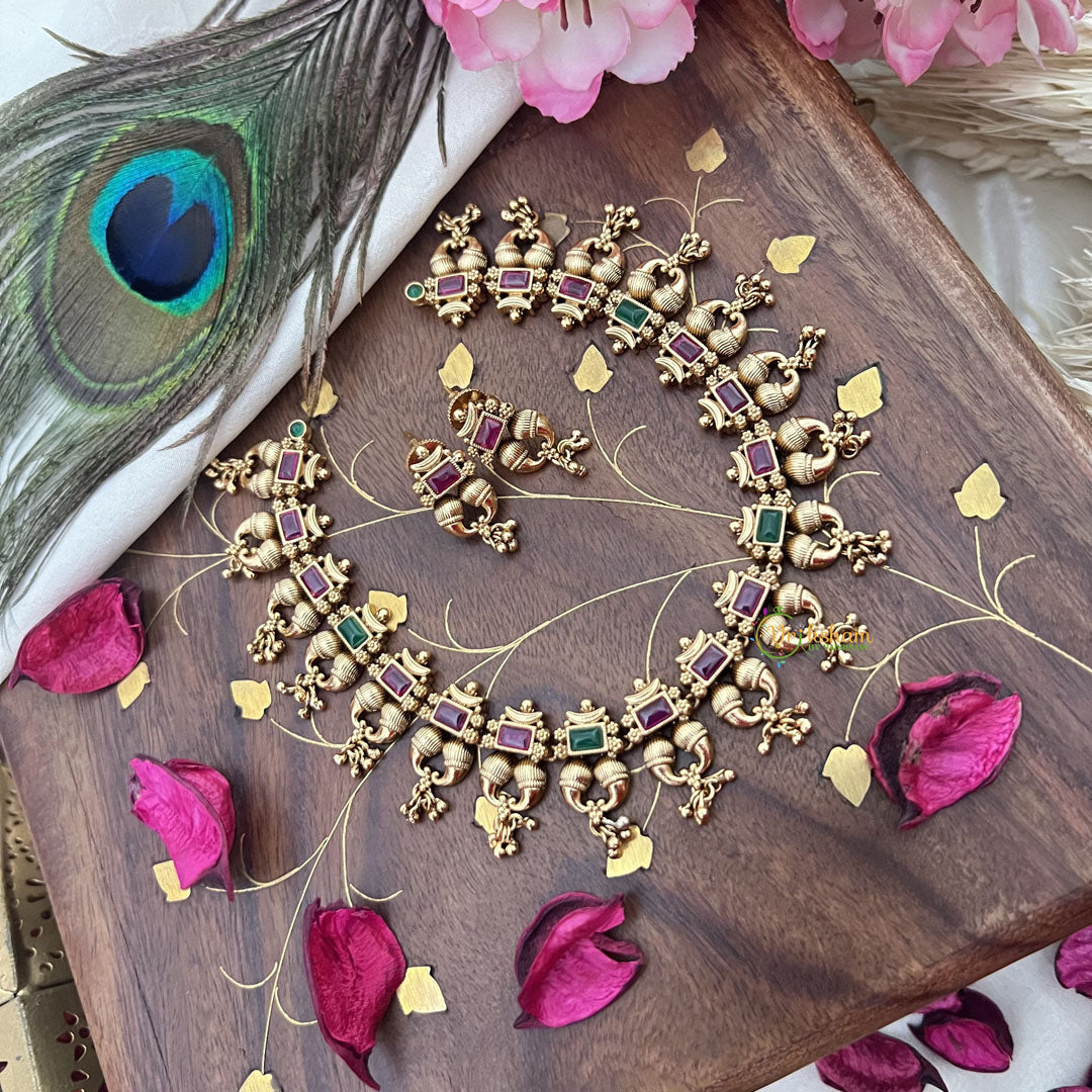 Elevate your style with the Vriksham Exquisite Designer Short Neckpiece. This radiant red green necklace features intricate design and high-quality materials, perfect for adding a touch of luxury to any outfit. Make a statement and stand out from the crowd with this exclusive piece from Vriksham.