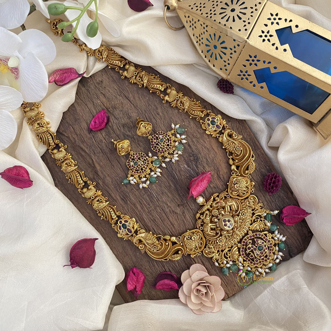 Indulge in the luxury of our Vriksham Exquisite Dual Elephant Long Neckpiece. Adorned with delicate rice pearls and vibrant green beads, this necklace is a true masterpiece. The dual elephant design adds a touch of elegance and sophistication, making it the perfect statement piece for any outfit. Elevate your style with this exclusive accessory.