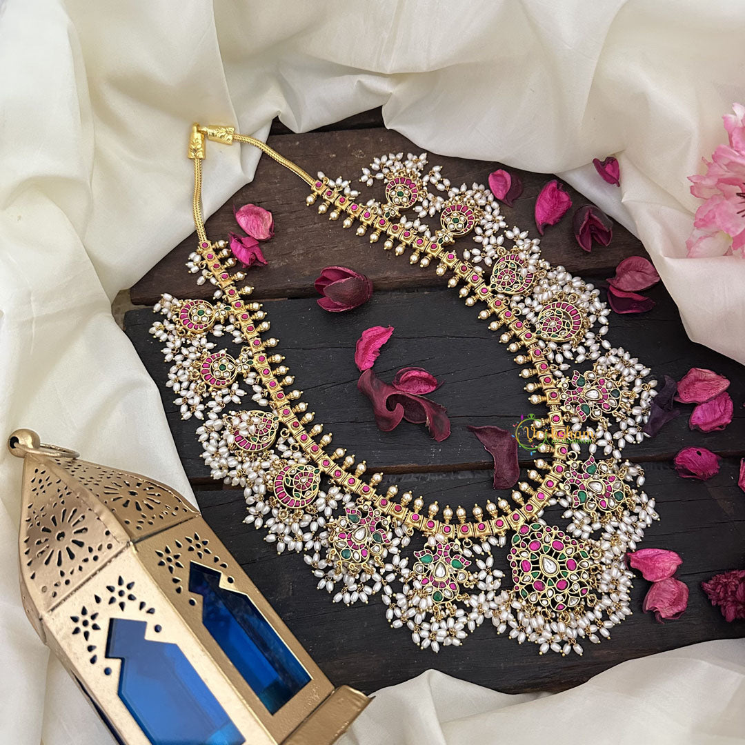 This Vriksham Exquisite Dual Peacock Guttapusalu Neckpiece is a stunning statement piece that will elevate any wardrobe. The intricate design, featuring dual peacocks, exemplifies the epitome of luxury. Made with premium materials, this neckpiece exudes elegance and exclusivity. Perfect for lovers of art and fashion.