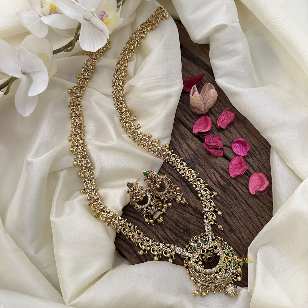 This exquisite floral neckpiece features a stunning dual peacock design adorned with sparkling AD stones and accented with golden beads. Elevate your style with this statement piece that exudes sophistication and elegance. A must-have for any fashion-forward individual.