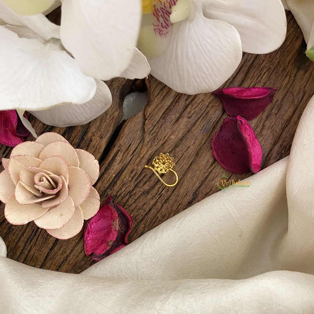 Elevate your style with Vriksham's Exquisite Floral AD Stone Nath/Nose pin in rich white. Adorned with sparkling stones, this unique piece adds an elegant touch to any look. Embrace the luxurious and exclusive feel of this handcrafted accessory, inspired by the world of art and fashion.