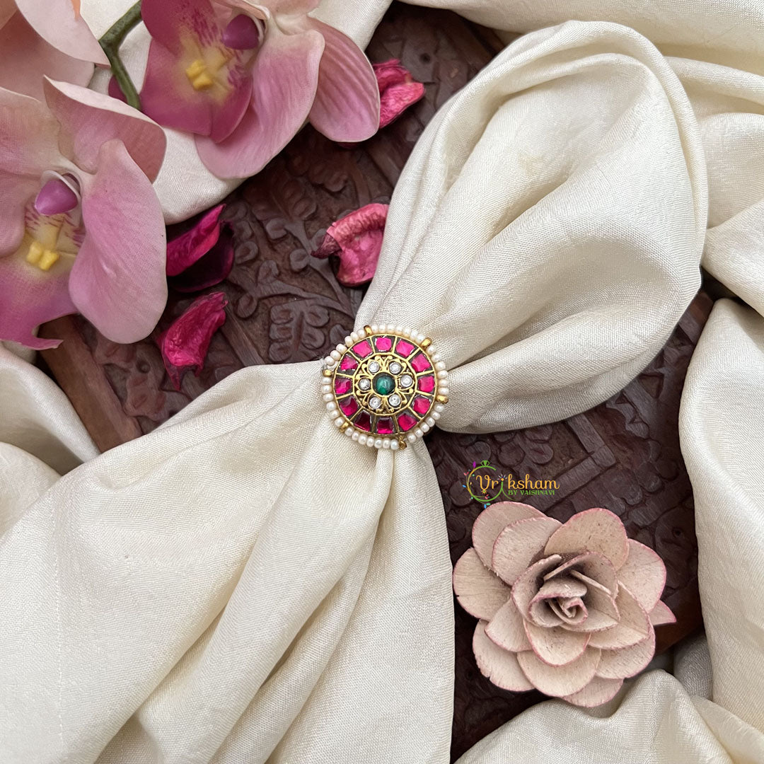 The Vriksham Exquisite Floral Jadau Kundan Finger Ring in red, green, and white, accented with pearls, showcases delicate floral motifs crafted with intricate kundan work. This sophisticated ring blends vibrant colors and elegant pearls, creating a timeless piece that enhances your traditional attire with refined beauty.