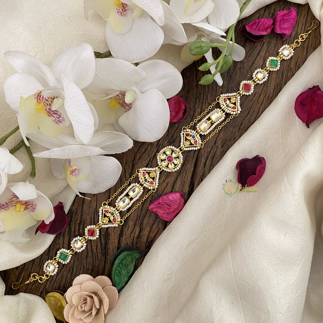 Introducing Vriksham's Exquisite Floral Kundan Jadau Sheeshphool. This luxurious piece features intricate Kundan detailing and a delicate floral design that embodies elegance and sophistication. Handcrafted with utmost care, it is a true masterpiece that will add a touch of exclusivity to any outfit. Elevate your style with Vriksham.