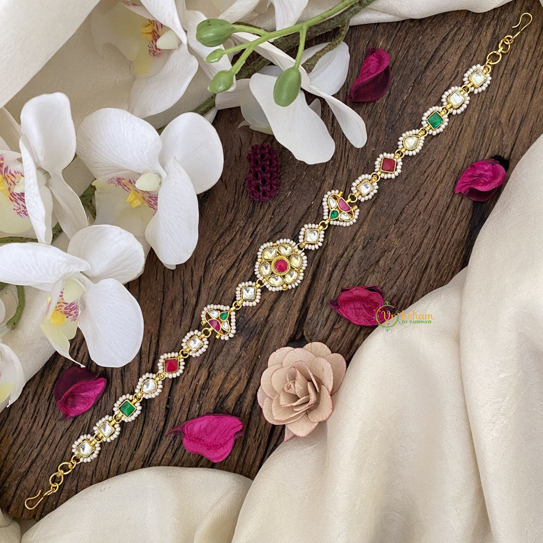 Indulge in the luxurious beauty of Vriksham's Exquisite Floral Red Green & White Kundan Jadau Sheeshphool. Adorned with intricate floral designs, this piece exudes elegance and exclusivity. Handcrafted with the finest materials, it is a true work of art that will elevate any outfit.