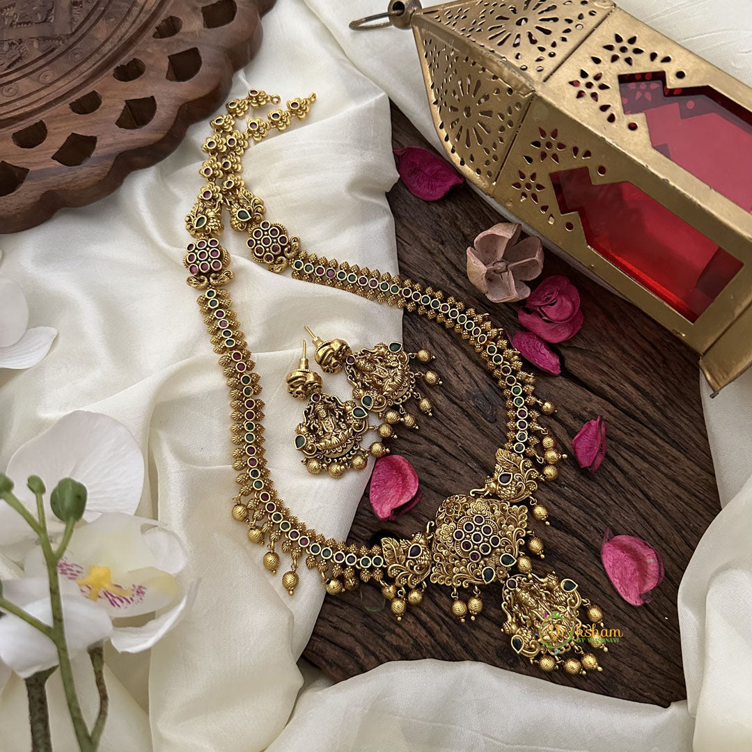 Indulge in luxury with our Vriksham Gold Look Alike Red Green Stone Lakshmi Pendant Neckpiece. The intricate design features a stunning combination of red and green stones, complemented by a delicate gold bead. Channel the divine energy of Lakshmi with this elegant and exclusive piece.