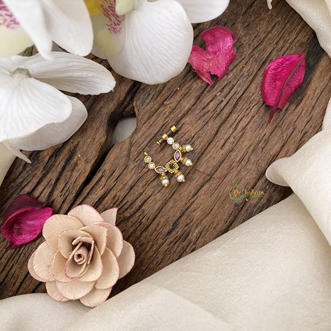 Indulge in the luxurious elegance of Vriksham's Exquisite Golden Naths/Nose pin. Adorned with a gleaming pearl and exquisitely crafted in a soft white red & green hue, this piece evokes a sense of high-end sophistication and refinement. Elevate your style with this stunning accessory that exudes opulence and grace.