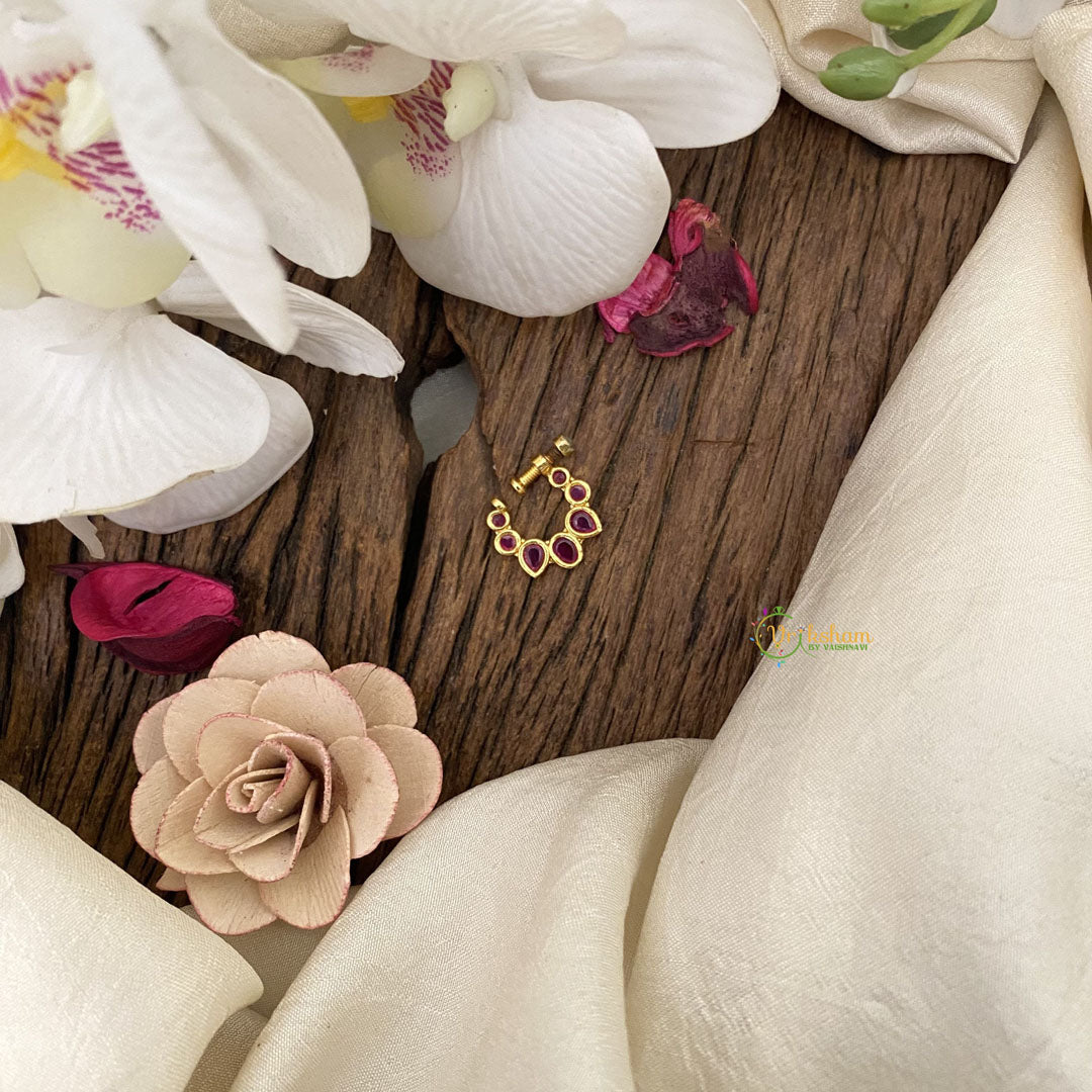 Enrich your beauty with Vriksham's Exquisite Golden Nath/Nose pin. Made with premium materials, this red nose pin adds a touch of sophistication and luxury to your look. Elevate your style with this exclusive accessory that exudes elegance and glamour.