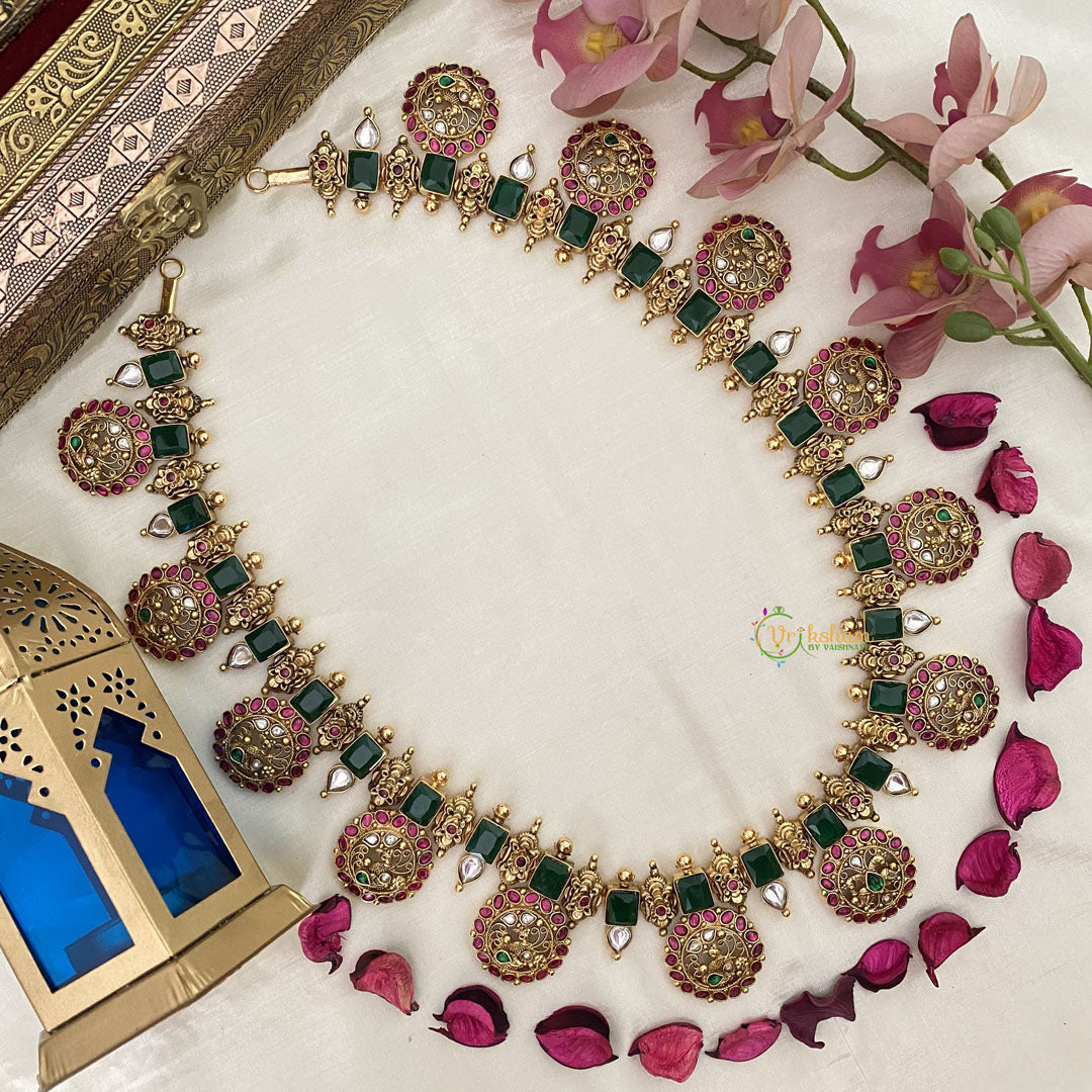 Indulge in luxury with our Vriksham Exquisite Green AD Stone Coin Style 1 gm gold Neckpiece. This stunning piece features intricately designed coins adorned with luscious green AD stones, exuding elegance and sophistication. Handcrafted with 1 gm of gold, it is the perfect blend of opulence and fashion. Elevate your style with this exclusive neckpiece.