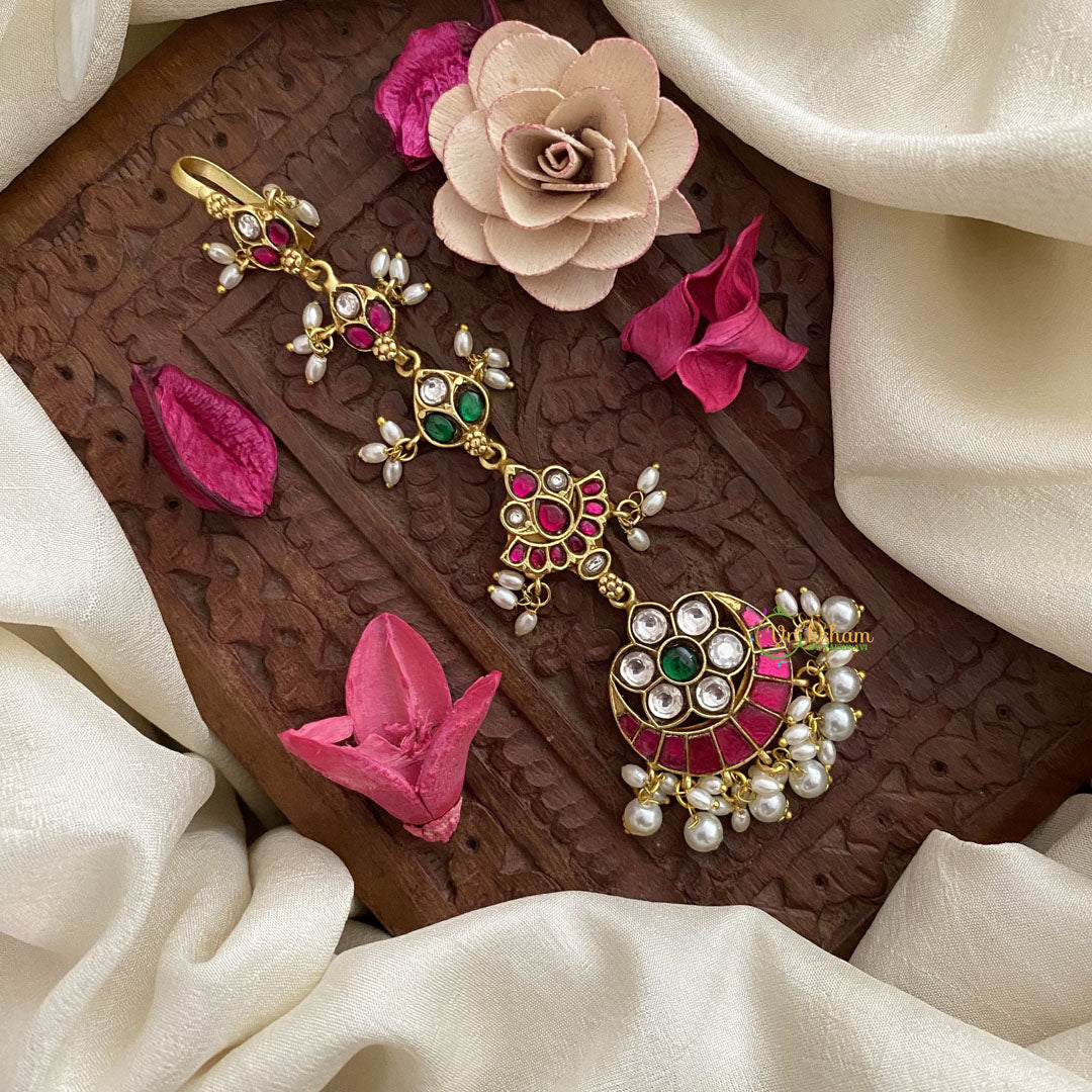This Vriksham Exquisite Half Moon Style Jadau Kundan Maang Tikka features stunning white beads and intricate Jadau Kundan work. Elevate any look with this elegant and exclusive piece, a true testament to luxury and sophistication. Perfect for adding a touch of elegance and beauty to any outfit.
