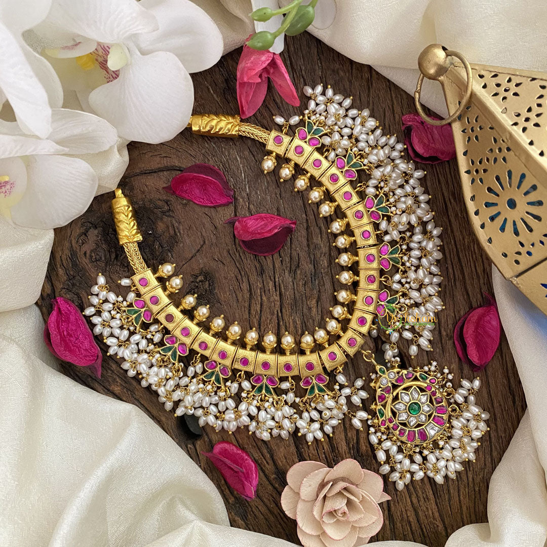 Indulge in luxury with our Vriksham Exquisite Jadau Kundan Short Neckpiece featuring stunning rice pearls. This sophisticated and exclusive piece will elevate any outfit, making you feel elegant and tasteful. Handcrafted with intricate details, it is a true work of art. Elevate your style today.