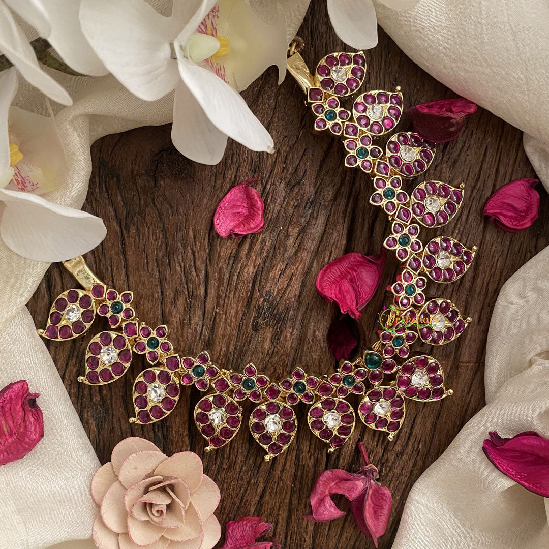 Indulge in the opulence of Vriksham's Exquisite Kemp Maanga Short Neckpiece. Crafted with care and adorned with exquisite Kemp Maanga stones, this necklace exudes luxury and elegance. Elevate any outfit with this exclusive piece, perfect for the modern, sophisticated woman.