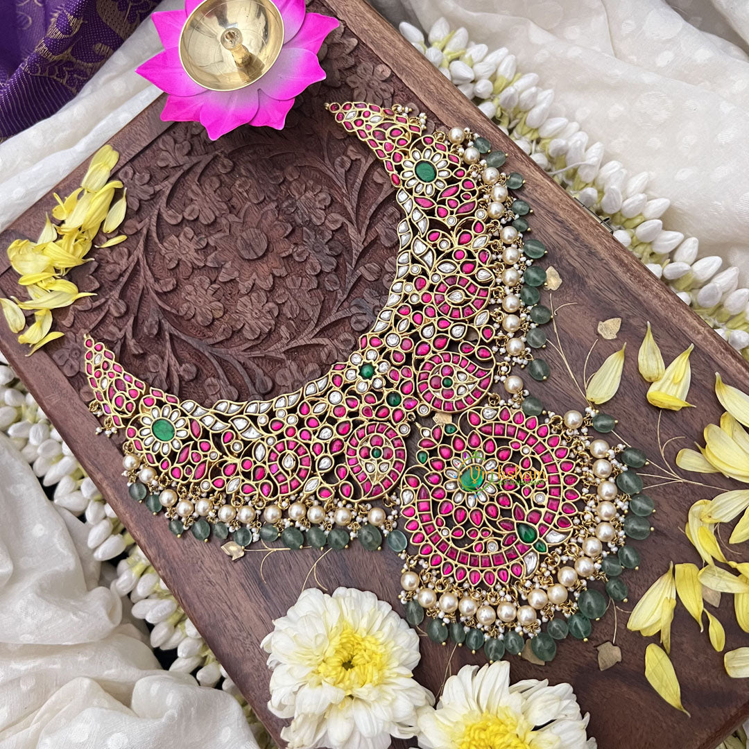 The Vriksham Exquisite Kundan Jadau Maanga Short Neckpiece in pastel green beads offers a refined blend of traditional artistry and delicate design. Featuring intricate kundan and jadau work, this short neckpiece is accented with soft pastel green beads, bringing understated elegance to any outfit. Ideal for formal events, it adds a polished, sophisticated charm that enhances your style with subtle grace.