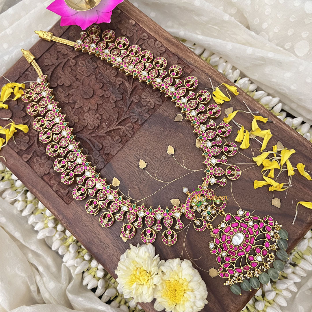 The Vriksham Exquisite Kundan Jadau Long Neckpiece features a beautifully crafted pendant accented with delicate pastel green beads. This sophisticated piece showcases fine Kundan Jadau artistry, offering timeless elegance that enhances any traditional ensemble with grace and poise.