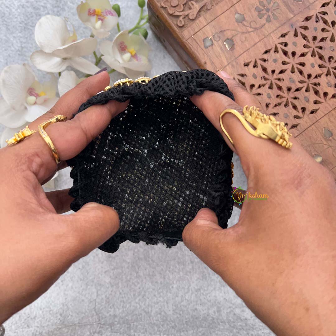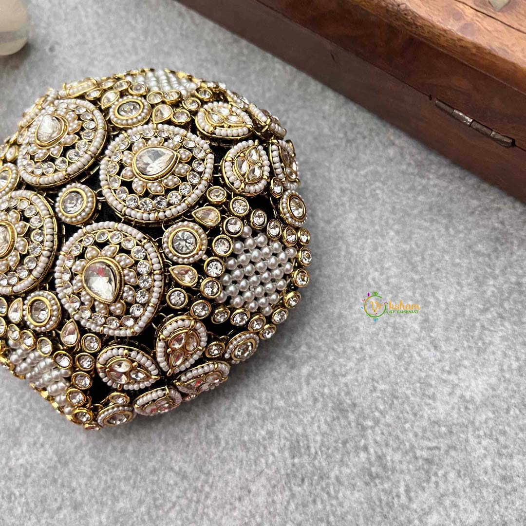 Elevate your traditional ensemble with this exquisite hair bun cage, meticulously crafted to complement your most graceful moments. Adorned with lustrous kundan stones and delicate pearls arranged in an elegant pear motif, this accessory transforms an ordinary bun into a statement of refined elegance. The intricate detailing catches light beautifully, adding dimension and sophistication to your hairstyle. Perfect for weddings, festivals, and special celebrations, this piece seamlessly blends timeless craftsmanship with contemporary design sensibilities. A versatile addition to any jewelry collection that speaks to those who appreciate the finer details of traditional artistry.