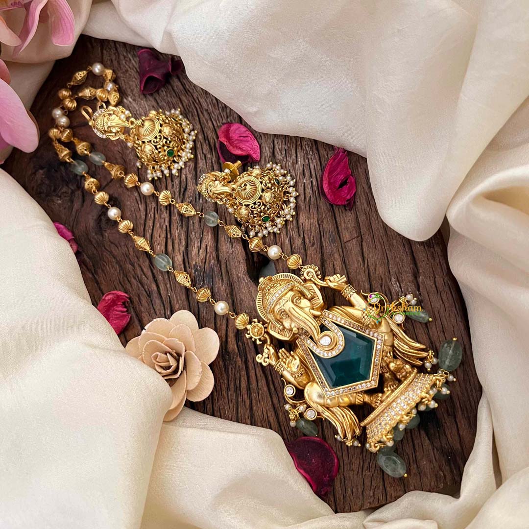 Celebrate divine elegance with this exquisite matte gold Lord Ganesha pendant, masterfully crafted to embody spiritual grace. The centerpiece features intricately handcrafted floral jhumkas that cascade with delicate artistry, while vibrant emerald accents add a touch of regal sophistication. Each detail reflects meticulous craftsmanship, blending traditional design with contemporary refinement. Perfect for those who appreciate sacred jewelry that transcends mere adornment, this piece serves as a meaningful expression of devotion and timeless style.