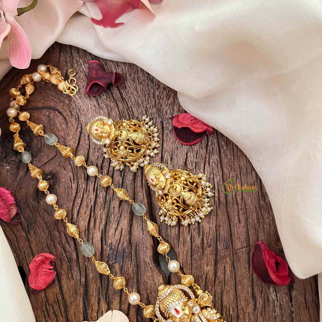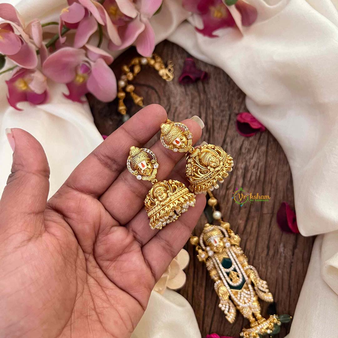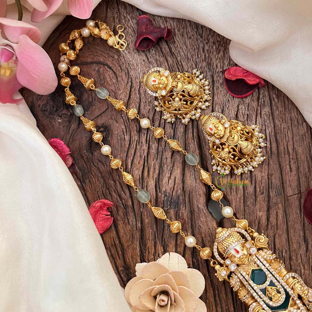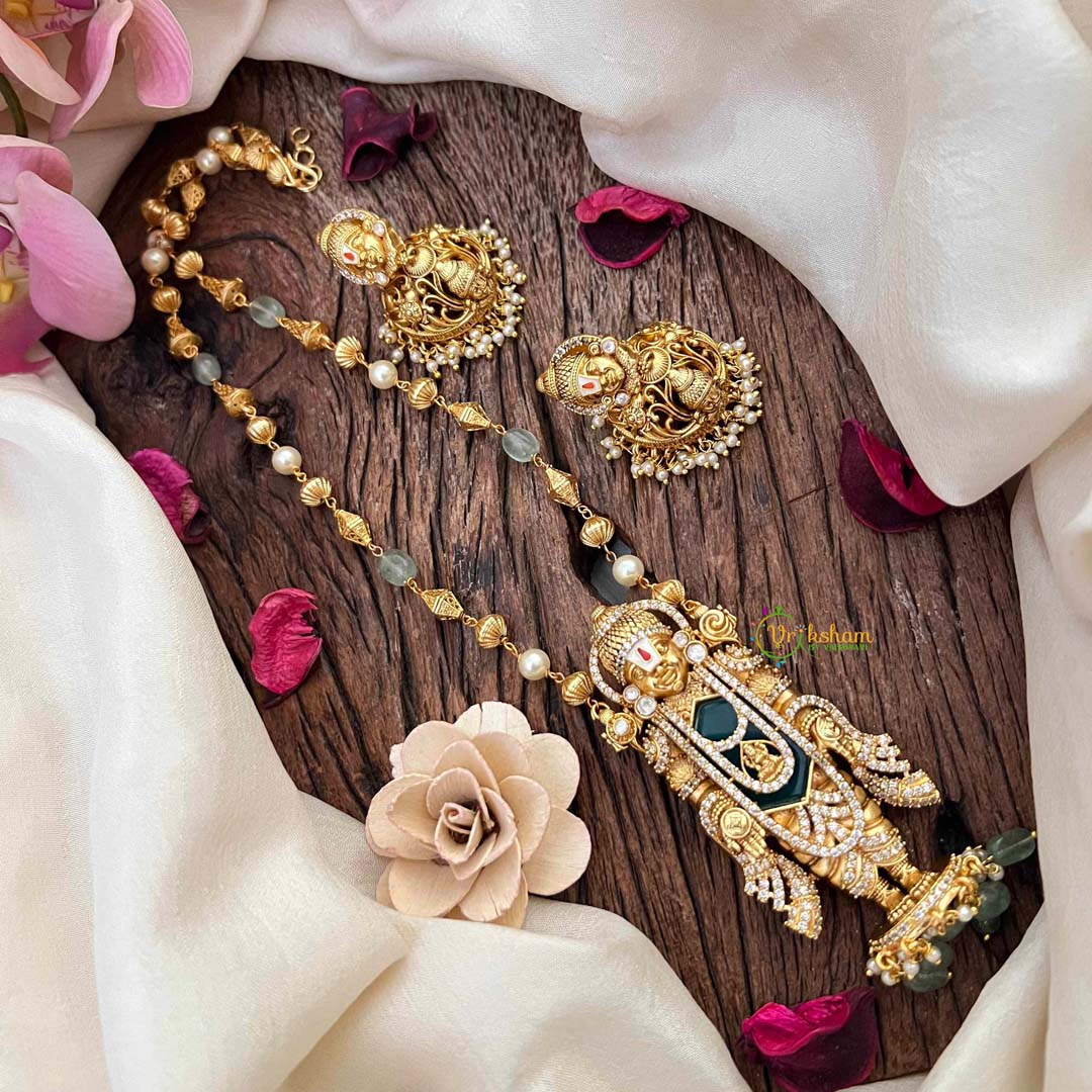 Embrace divine reverence with this stunning matte Tirupati Balaji pendant, a masterpiece of spiritual artistry. Adorned with meticulously handcrafted floral jhumkas and luminous emerald accents, this sacred piece radiates timeless elegance. The accompanying chain features soothing aqua green beads that complement the pendant's refined aesthetic, creating a harmonious blend of devotion and sophistication. Ideal for those seeking meaningful jewelry that honors tradition while celebrating exquisite craftsmanship, this pendant transforms any occasion into a moment of spiritual grace.