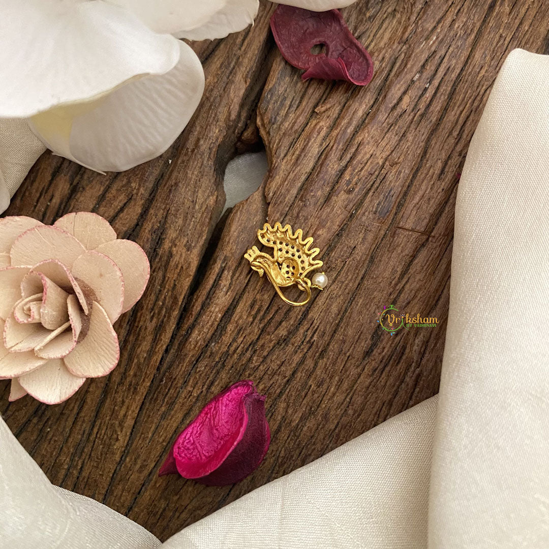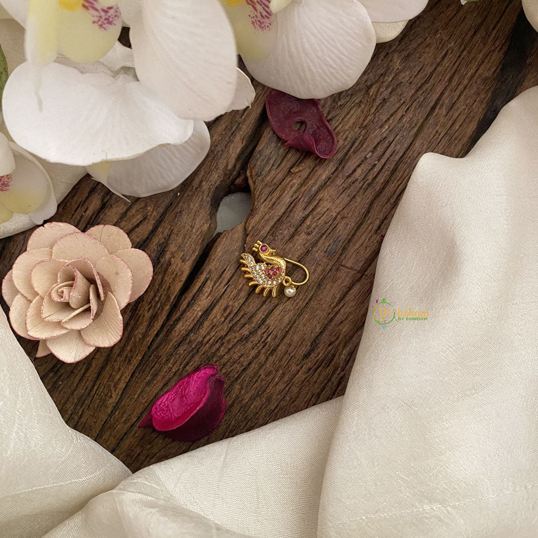 Elevate your look with our Vriksham Exquisite Peacock AD Stone Nath/Nose pin. This charming nose pin features stunning pearls and vibrant red stones, reminiscent of the majestic peacock. Elevate your style and embrace the elegance of this unique accessory.