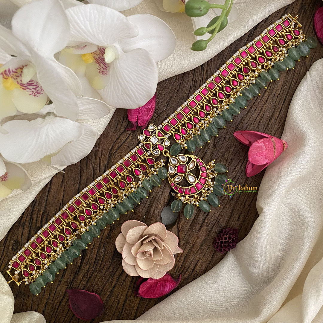 Indulge in luxury with the Vriksham Exquisite Red Kundan Jadau Pastel Green Bead Choker. Handcrafted with intricate details, this choker is a statement piece that exudes sophistication and exclusivity. The combination of red kundan and pastel green beads adds a touch of elegance, making it the perfect accessory for any occasion. Elevate your style and make a lasting impression with this exquisite choker.