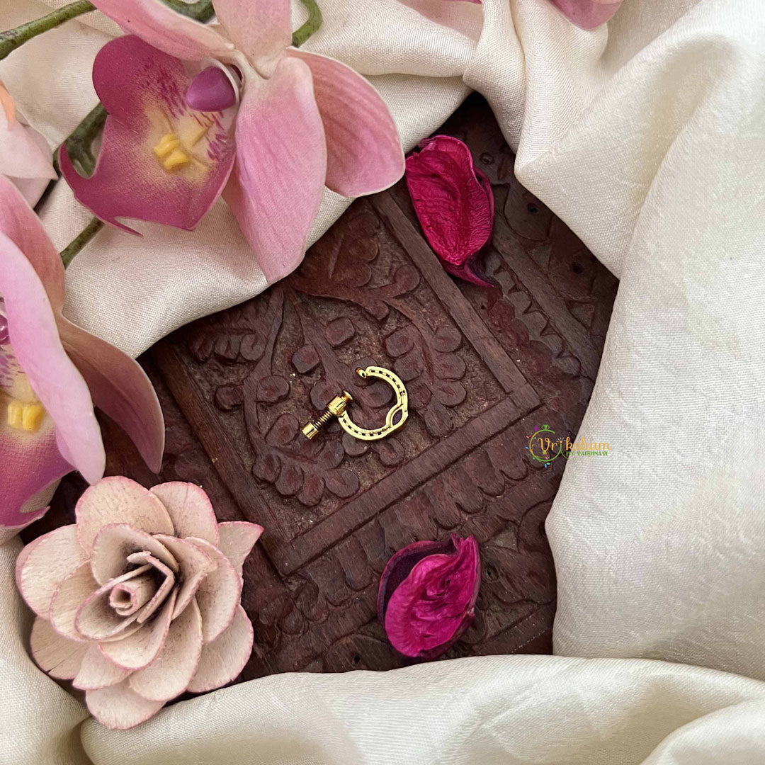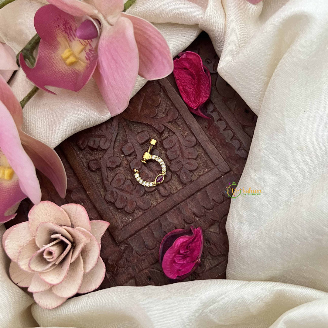 The Vriksham Eye Style Press Naths in red and white showcases a refined eye-shaped design accented with subtle color contrasts. Engineered for a secure and comfortable fit, this nose pin offers a sophisticated touch that enhances both traditional and contemporary ensembles with elegant flair.