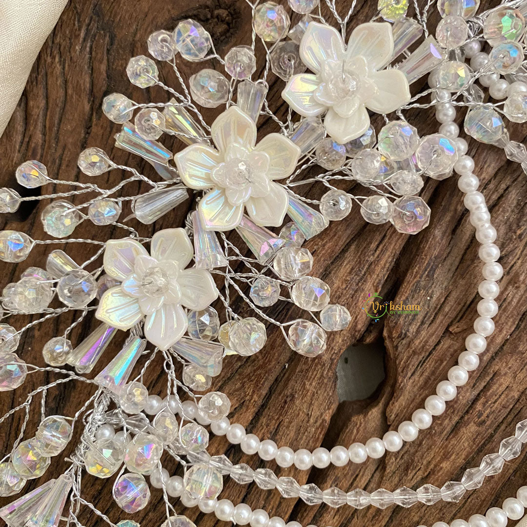 Elevate your bridal hairstyle with our Vriksham Fancy White Floral Beaded Bun Juda Bridal Brooch. This luxurious piece adds a touch of elegance and sophistication. Handcrafted with intricate beading, it beautifully complements any hairstyle, making you the center of attention on your special day. Make a statement and exude effortless glamour with this exquisite brooch.