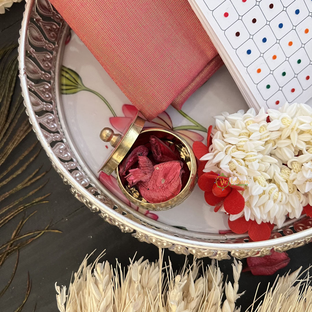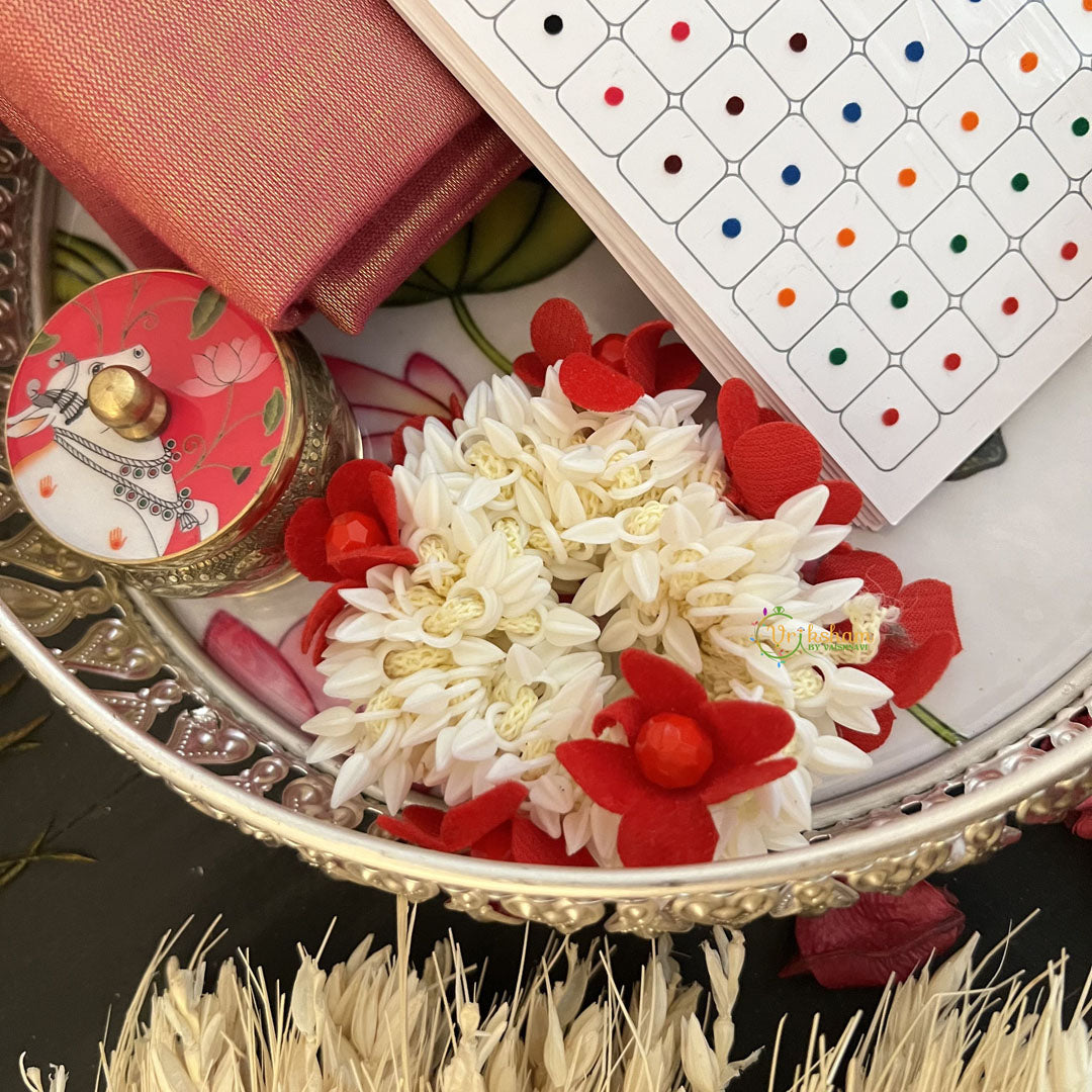 The Vriksham Festival Gift Hamper is a tasteful ensemble featuring a kumkum box, a curated bindi book, blouse bits, and fragrant jasmine scrunches. Designed to blend tradition with elegance, this hamper makes a thoughtful gift that enhances the festive spirit with subtle sophistication.