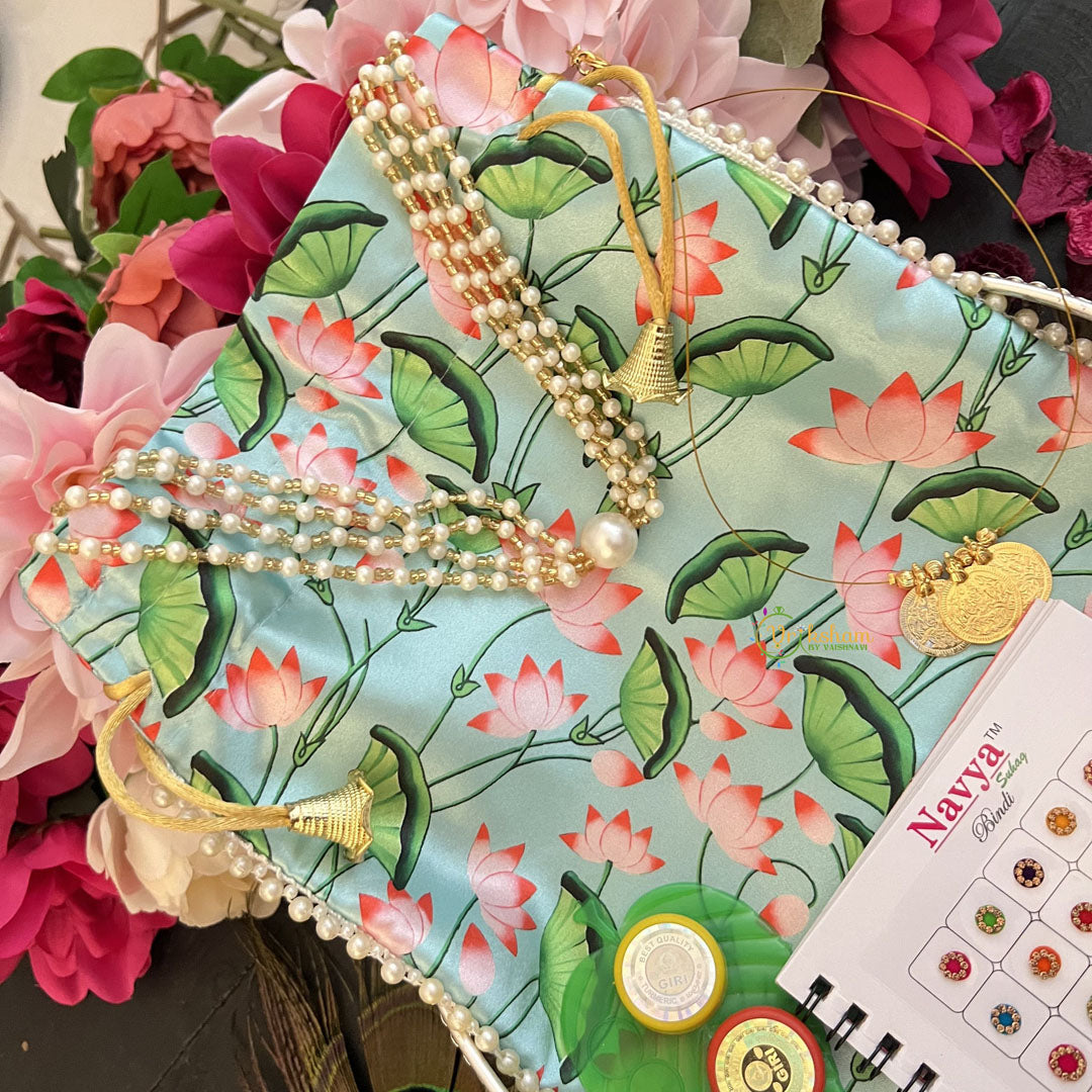 The Vriksham Festival Gift Hamper features a tasteful collection including a stylish potli bag, a curated bindi book, a subtle invisible chain, and a traditional kumkum box. This elegant hamper blends cultural charm with refined sophistication, making it a perfect gift to honor the festive spirit.