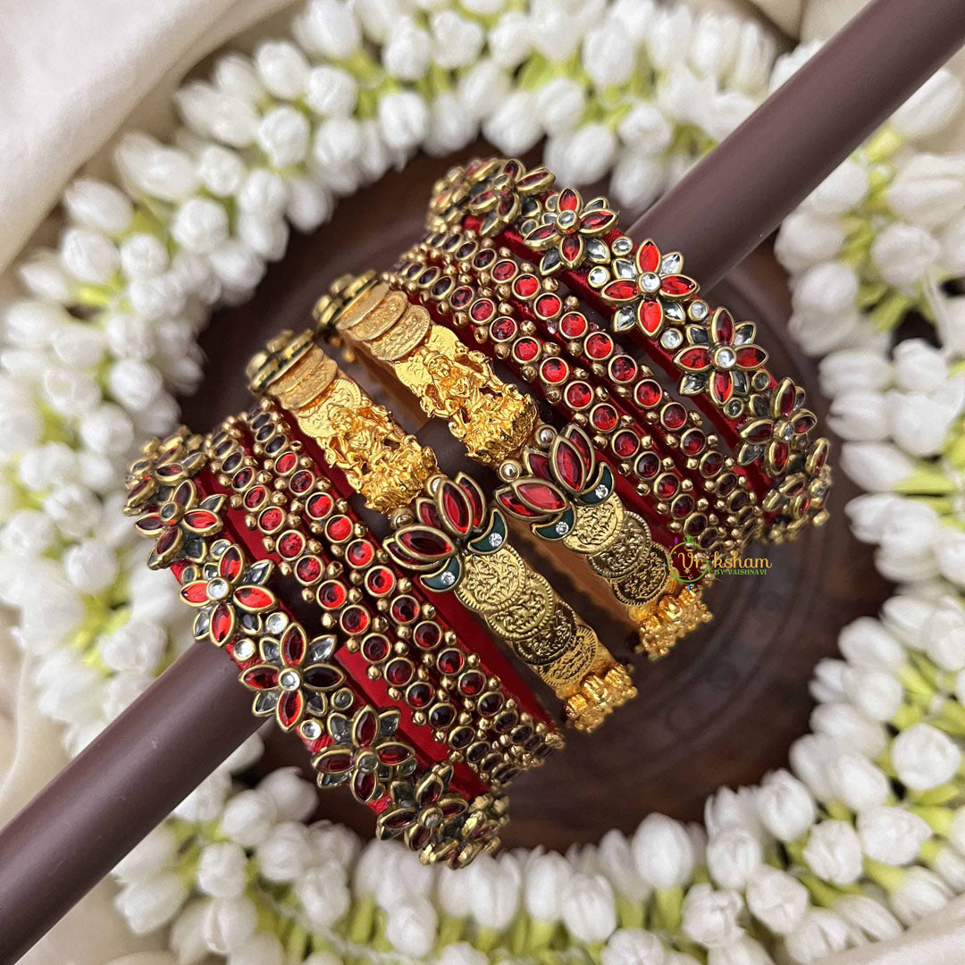 Celebrate auspicious moments with this exquisite bridal bangles set, featuring the sacred Lakshmi coin motif symbolizing prosperity and abundance. Crafted in royal red with intricate floral detailing, each bangle showcases traditional artistry blended with contemporary elegance. Perfect for weddings, festivals, and special occasions, this set combines spiritual significance with timeless beauty. The rich crimson hue complements traditional bridal attire while the ornate design adds a touch of grandeur to your festive ensemble. An ideal choice for those seeking meaningful jewelry that honors cultural heritage.
