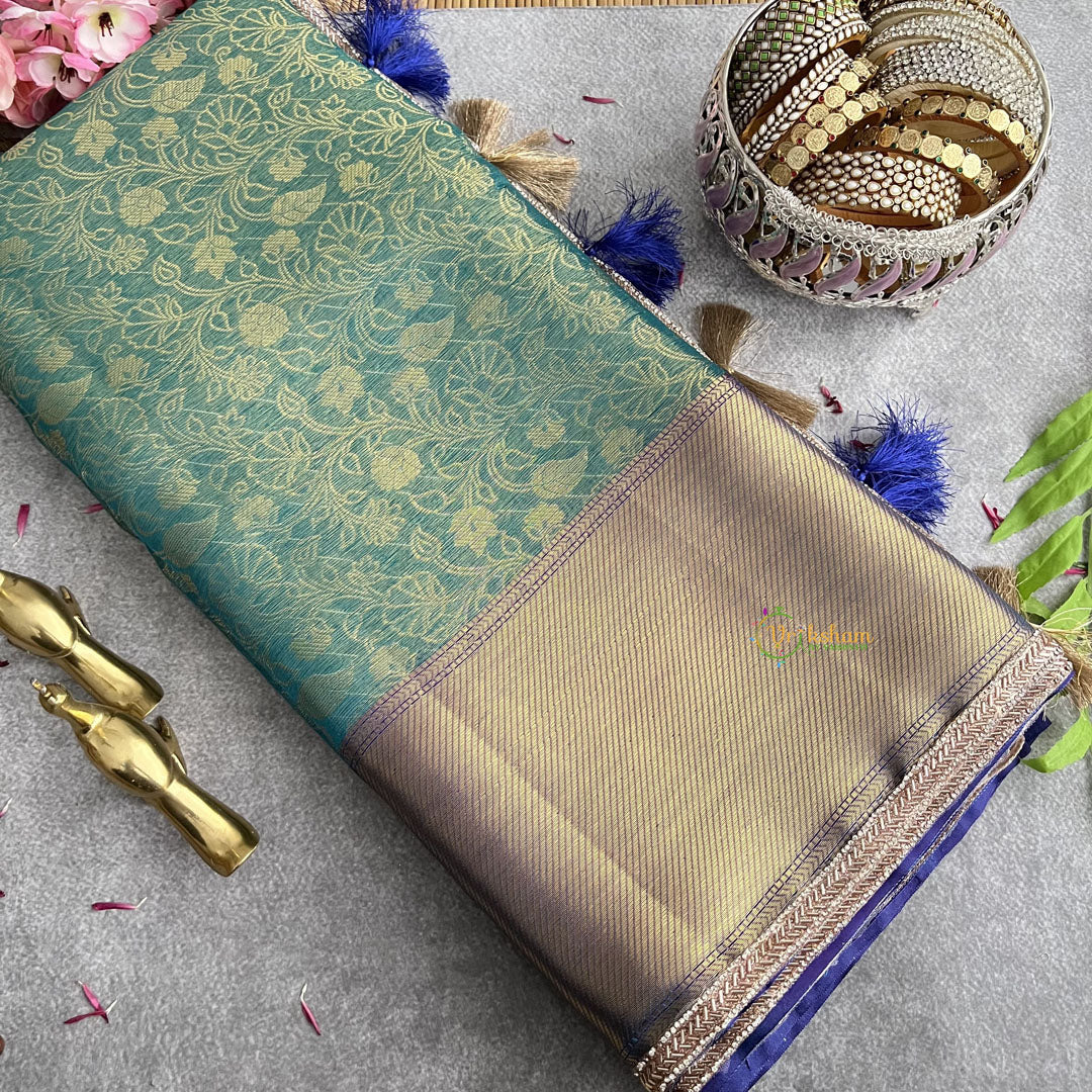 Step into luxury with our Vriksham Firosa organza saree. Handloomed with a vibrant firosa color and a contrasting blue border, this saree is a work of art. Made from premium quality organza, it exudes elegance and exclusivity. Elevate your style with this sophisticated and timeless piece.