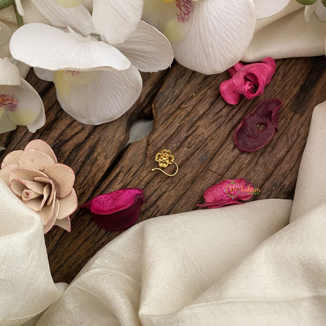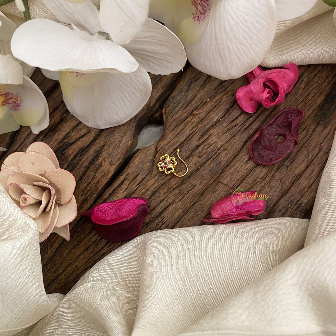 Introducing the elegant Vriksham Floral AD Stone Nath, a nose pin that will make you stand out. Crafted with exquisite white, red, and green stones, this piece is a piece of art. Elevate your style and make a statement with this luxurious and exclusive accessory.