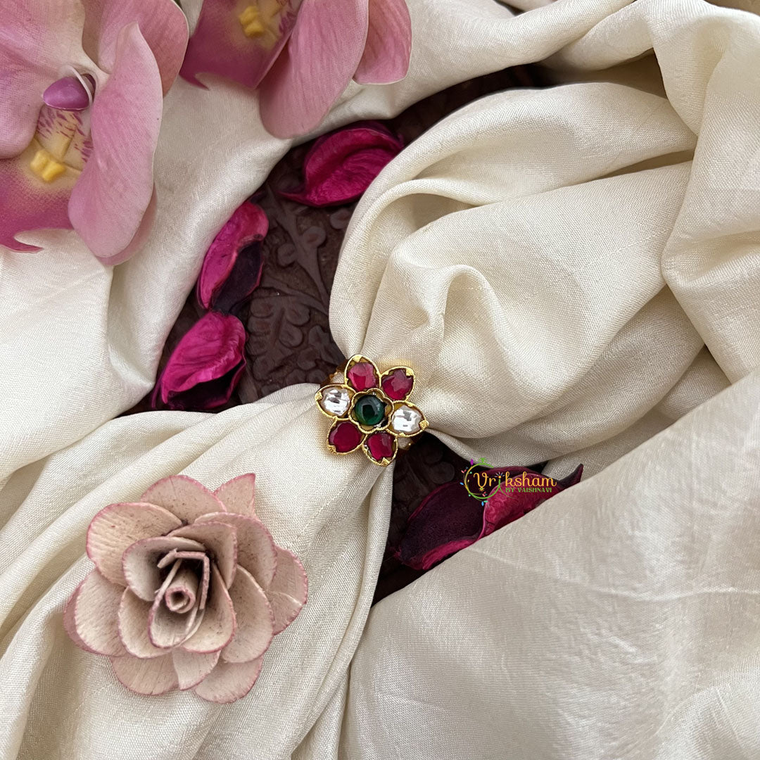 The Vriksham Floral Adjustable Statement Kundan Jadau Finger Ring combines red, green, and white stones in a beautifully crafted floral design. Its adjustable band offers a perfect fit, while the vibrant gemstones and intricate craftsmanship create a sophisticated statement piece ideal for elevating any elegant ensemble.