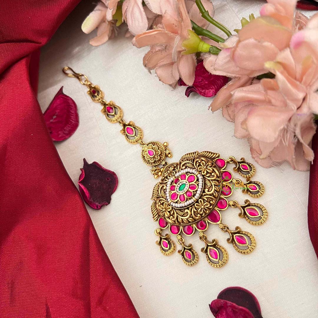 Captivate with this exquisite maang tikka, featuring an ornate floral center that serves as a stunning focal point. Delicate teardrop dangles adorned with lustrous pearls cascade gracefully, creating an enchanting interplay of movement and light. The harmonious blend of red and white tones adds vibrancy and depth to this refined piece. Ideal for brides seeking jewelry that combines botanical elegance with timeless sophistication, this maang tikka transforms any occasion into a memorable celebration of beauty and cultural artistry.