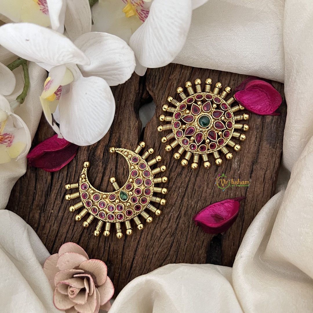 The Vriksham Floral & Crescent Design Chandran & Suryan Billai in red and green features an elegant fusion of vibrant hues and intricate motifs. This sophisticated piece blends floral and crescent designs, offering a refined accessory that enhances traditional attire with a touch of contemporary elegance.