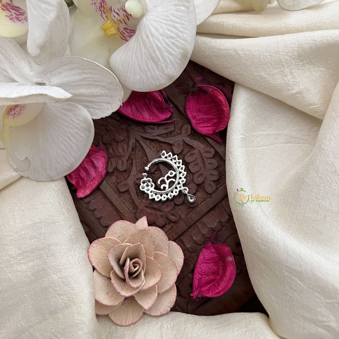 The Vriksham Floral Crescent Nath in silver showcases an elegant crescent design adorned with delicate floral motifs. This press-on nose pin combines traditional artistry with modern convenience, offering a comfortable and secure fit. Its sophisticated style adds a graceful touch to any outfit, making it a perfect accessory for special occasions or everyday elegance.