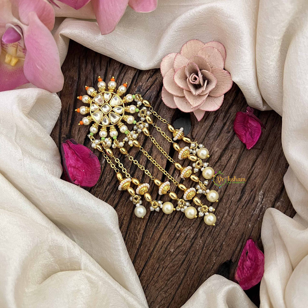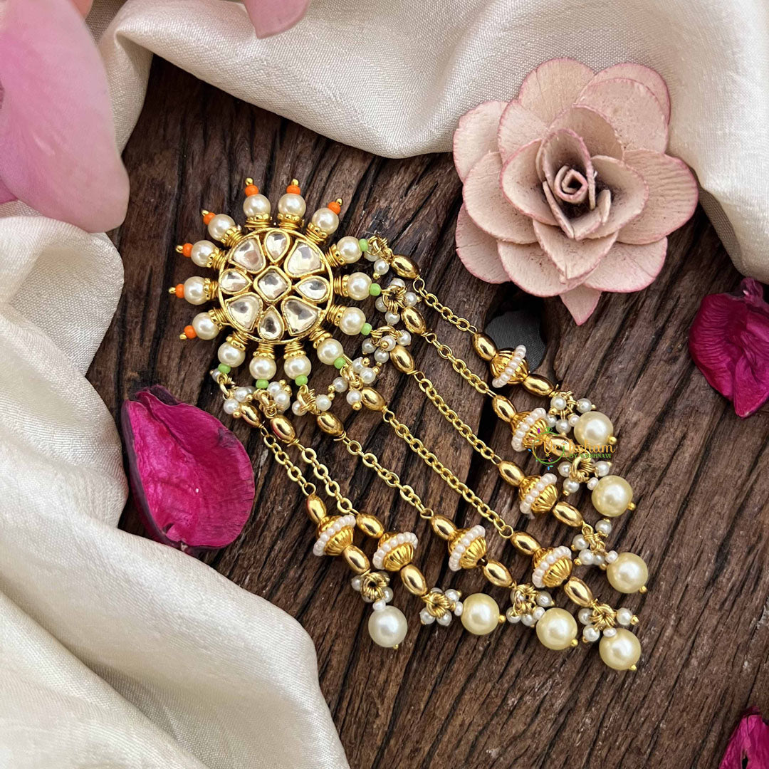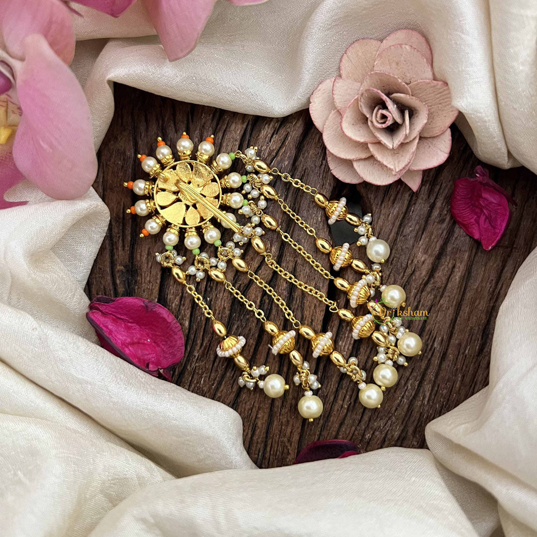 Discover understated luxury with this stunning Jada Billai, where vibrant orange and green beads come together in an elegant floral motif. The cascading white pearls line drop creates a graceful movement that complements traditional and contemporary attire alike. Meticulously handcrafted, this piece showcases the finest in artisanal jewelry design, perfect for weddings, celebrations, and festive occasions. The harmonious blend of warm and cool tones adds depth and character to your appearance, while the refined pearl detailing ensures an air of timeless sophistication. An investment in authentic craftsmanship that elevates any special occasion wardrobe.