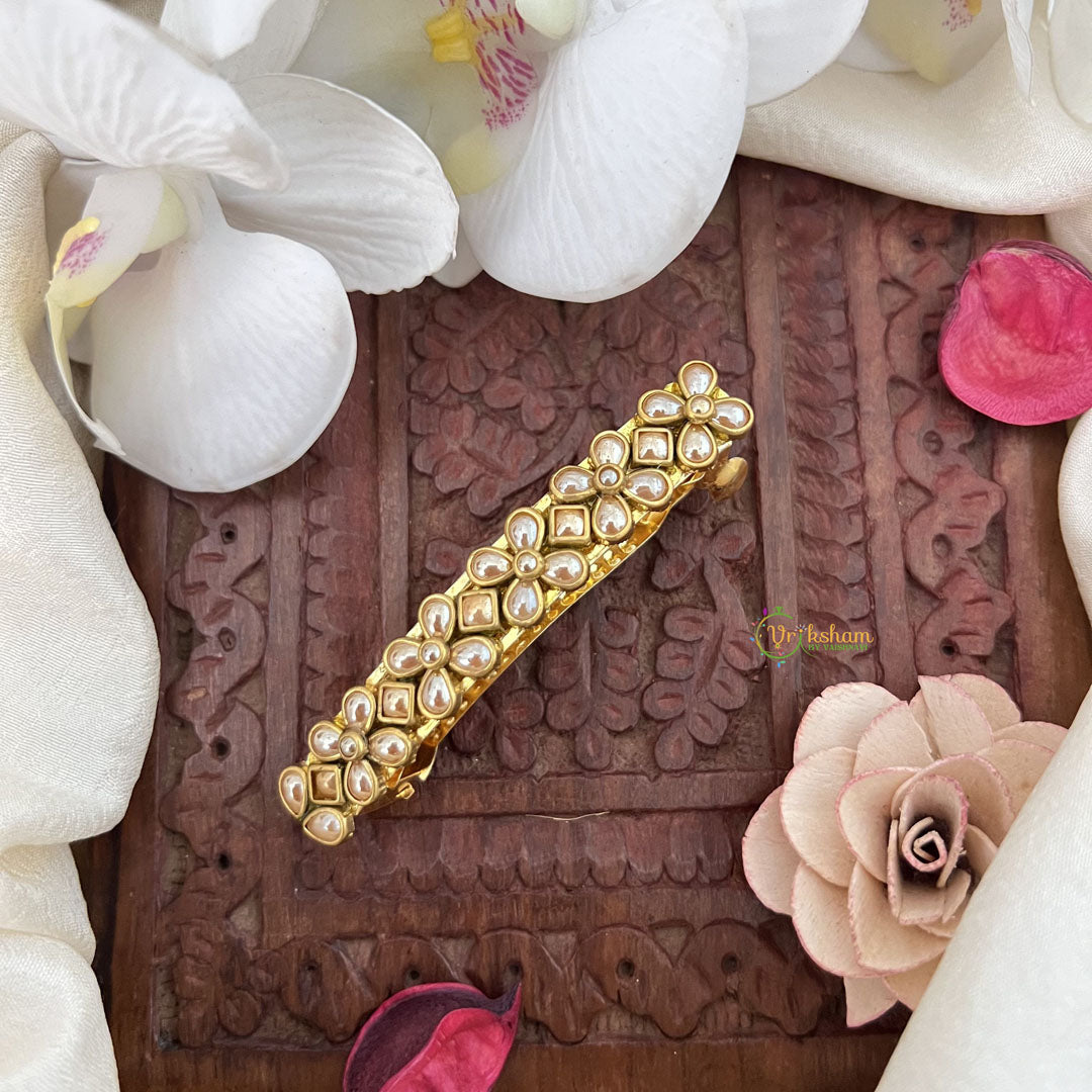 Introduce an elegant touch to your hairstyle with the Vriksham Floral Golden Kundan Hair Clip. This premium hair accessory features delicate floral designs and sparkling kundan stones, perfect for adding a touch of luxury to any look. Its sturdy clip ensures a secure hold, making it a practical and stylish addition to your collection.