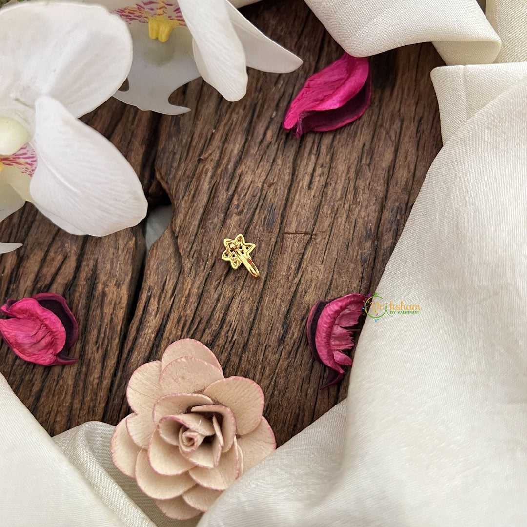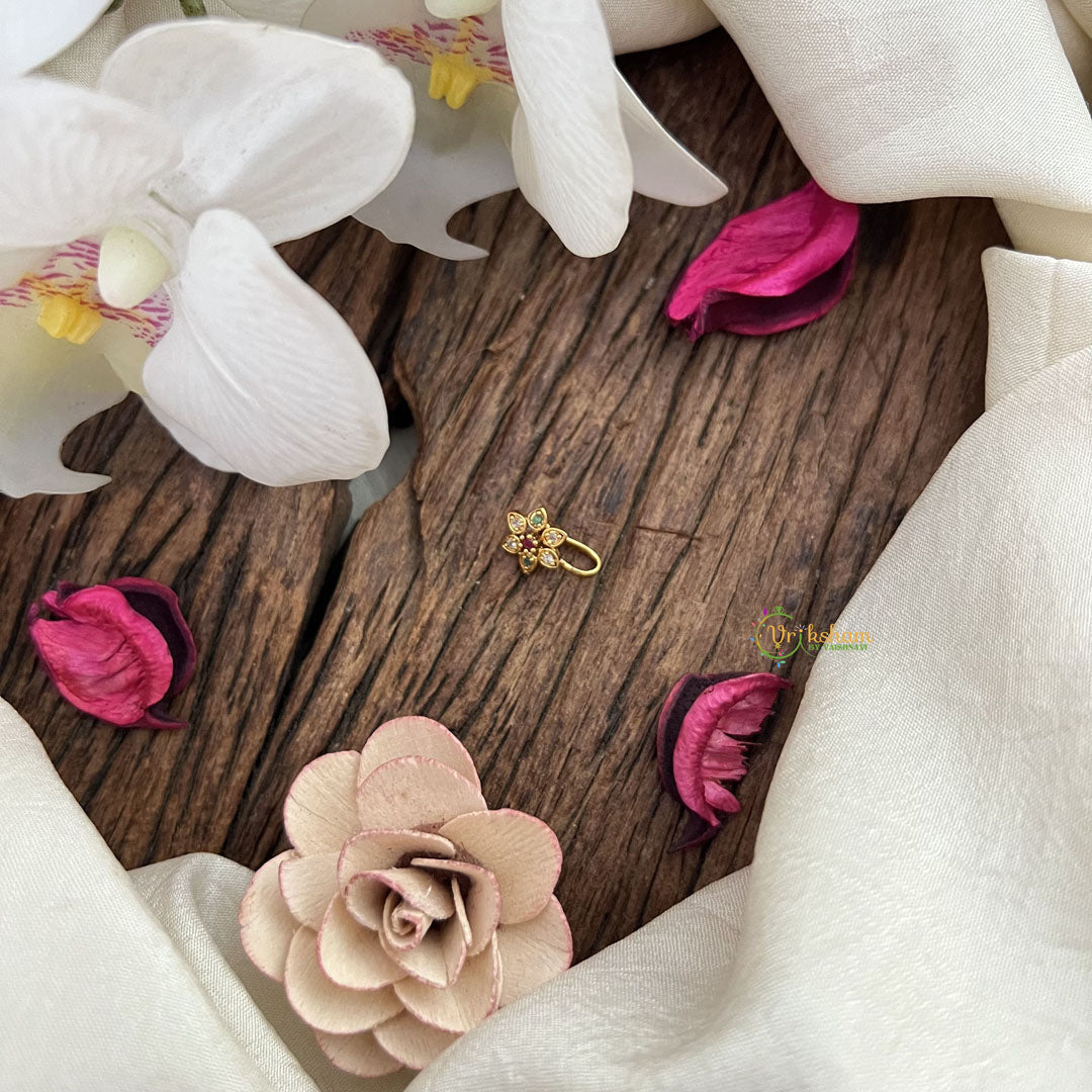 The Vriksham Floral Golden Naths/Nose Pin in red, white, and green features an elegant floral motif that blends vibrant colors with refined craftsmanship. This sophisticated accessory enhances your traditional or contemporary attire with a delicate touch of grace, making it an ideal choice for special occasions or everyday elegance. Its timeless design adds subtle charm to your overall look.